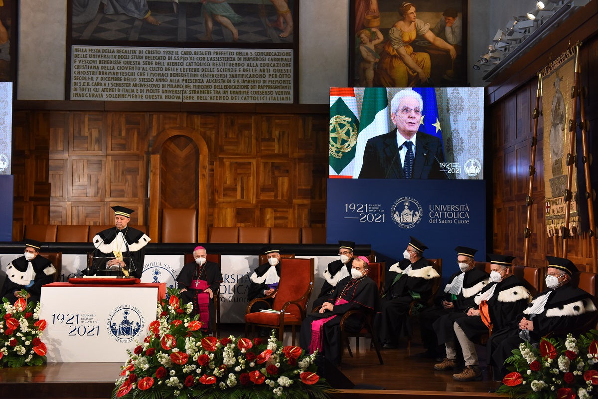 Il ricordo va alle vittime del Covid (che non ha risparmiato anche diverse componenti della Cattolica) e l’«apprezzamento è nei confronti dell’Università per il mantenimento della funzionalità che hanno attenuato le privazioni e le restrizioni subìte dagli studenti». «Dal momento della fondazione il contributo dell’Università è sempre stato di grande rilievo», aggiunge il Presidente, che ricorda i docenti e laureati della Cattolica facenti parte dell’Assemblea costituente: «Si avverte un senso di comunità, ribadito con forza oggi, in epoca di pandemia», come dimostra «l’opera del Policlinico “Gemelli”», evidenzia.