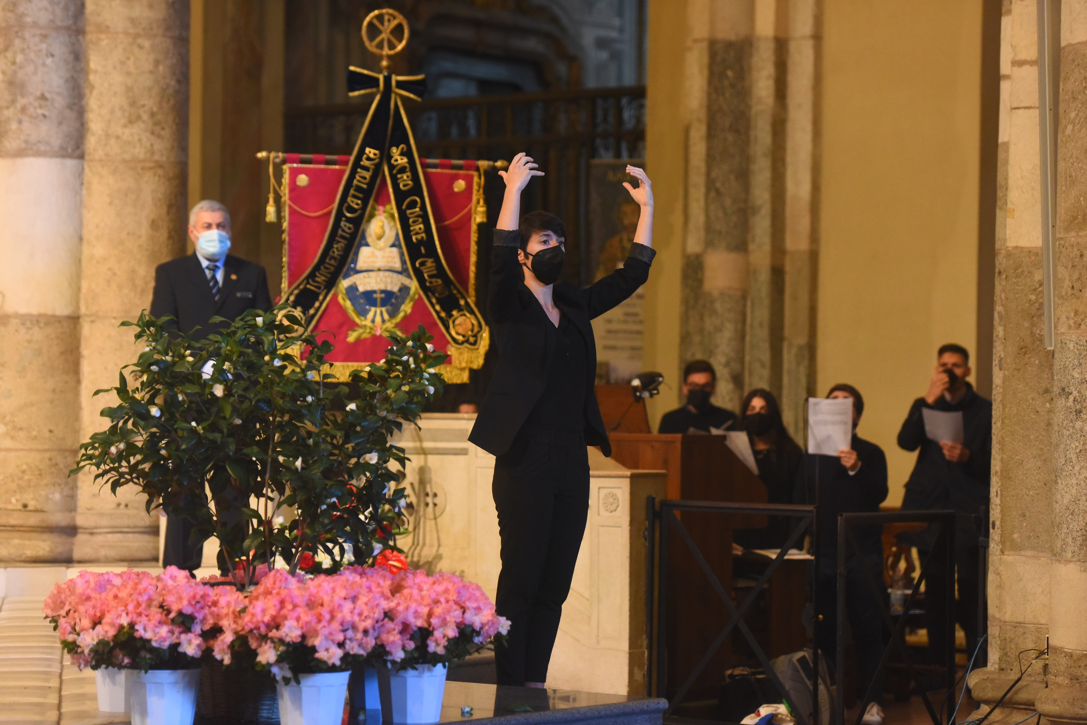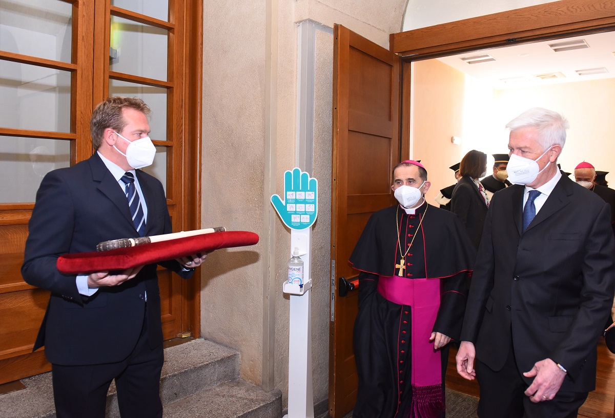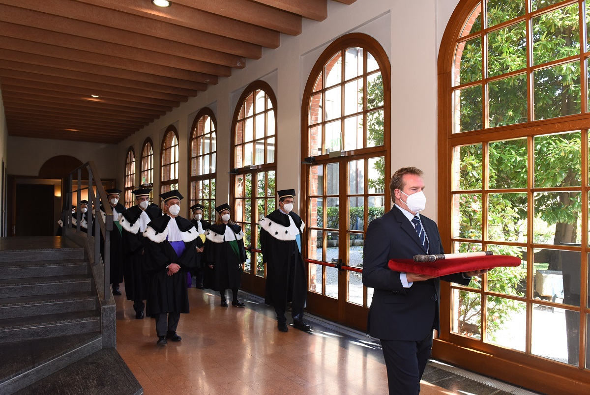 L’Aula magna, in tempo di pandemia, è molto diversa da quella di altrie affollatissime inaugurazioni, ma come dice il professor Anelli «non abbiamo ragione di sentirci soli», anche perché dal Quirinale è collegato il presidente della Repubblica Sergio Mattarella – come i sindaci delle città che ospitano le quattro sedi dell’ateneo, Milano, Roma, Piacenza, Brescia – e perché sono moltissimi gli studenti e docenti che seguono l’inaugurazione in diretta streaming. In presenza, infatti, ci sono solo il Rettore, attorniato dai presidi delle 12 Facoltà, monsignor Delpini nella sua veste di Arcivescovo, Gran Cancelliere dell’Ateneo e presidente dell’Istituto Giuseppe Toniolo di Studi Superiori (ente fondatore e garante della Cattolica) e l’assistente ecclesiastico generale, monsignor Claudio Giuliodori.