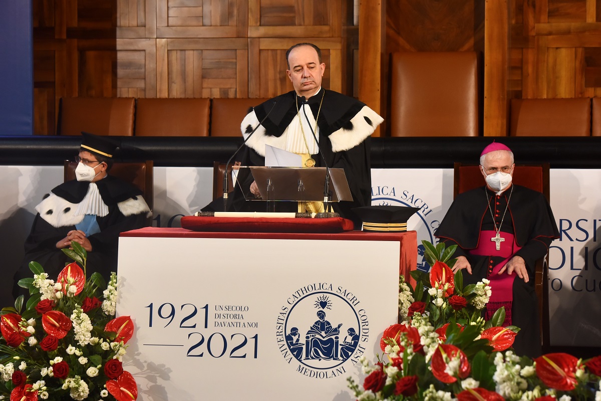 «Il valore sociale di un’Università si misura dalla qualità delle persone che ha educato». Potrebbe essere questa espressione – pronunciata dal rettore dell’Università Cattolica Franco Anelli nel suo discorso per l’inaugurazione dell’anno accademico -, la cifra e la sintesi più alta dei 100 anni di storia dell’ateneo, anniversario che proprio questa cerimonia inaugura. Sugli schermi scorrono le immagini storiche di una lontana Cattolica in bianco e nero, dal 1921 – con i fondatori padre Gemelli, Armida Barelli, Ludovico Necchi, monsignor Francesco Olgiati, Ernesto Lombardo e l’originario ispiratore Giuseppe Toniolo – fino al dopoguerra e ai fermenti del 1968. Tanti i numeri, sempre in crescita, di iscritti, laureati, docenti e personale, sedi, corsi, a testimoniare una storia gloriosa che guarda al futuro. Oltre 45 mila iscritti attualmente (nel 1921 erano 68); 14.445 immatricolazioni per l’anno 2020-2021, con una crescita di oltre il 3% rispetto all’anno precedente.