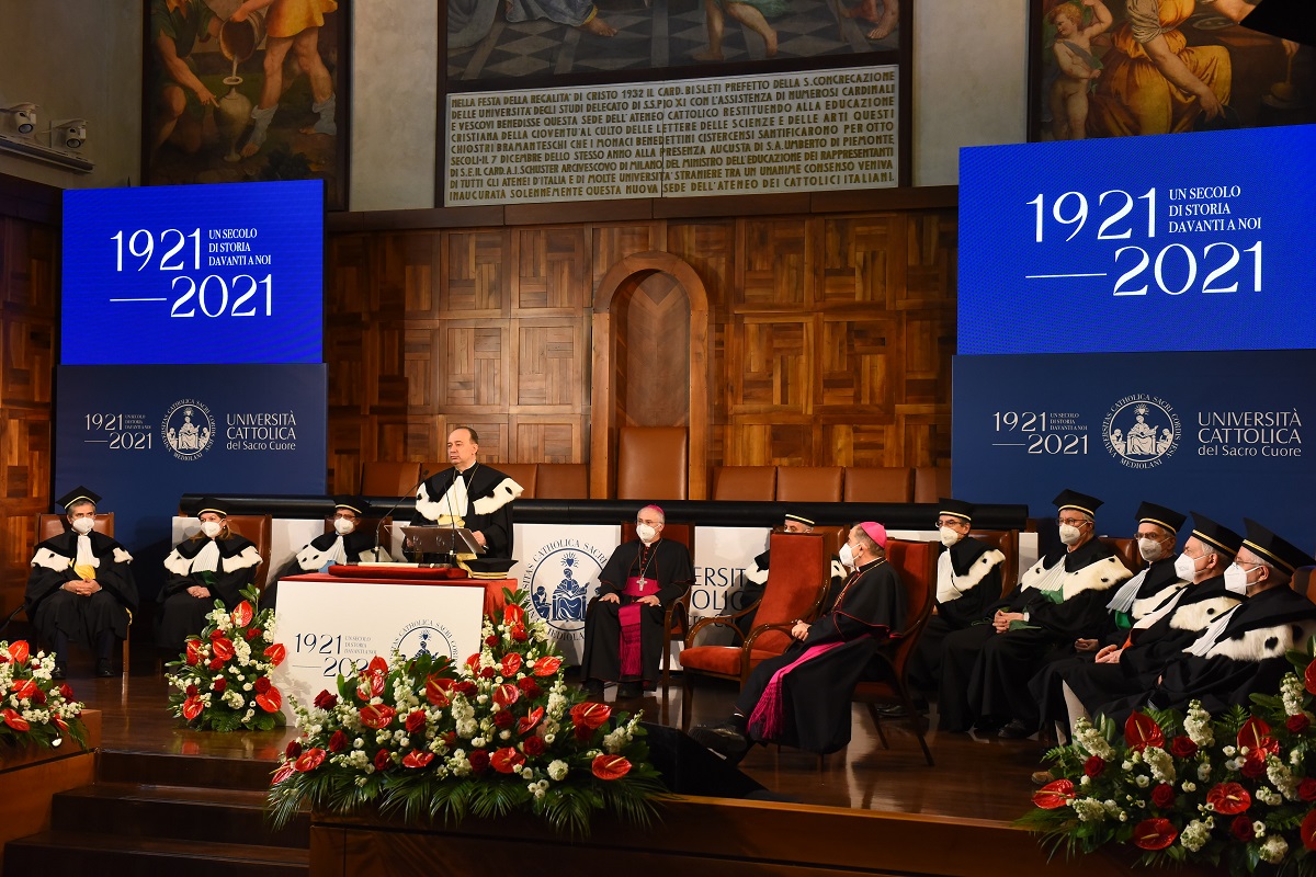 «L’Università Cattolica ha attraversato il Novecento e tutti i suoi rivolgimenti, affrontato i momenti difficili e contribuito con passione a quelli di crescita, ha insomma accompagnato l’evoluzione della società italiana, sempre restando testimone dei propri valori, salda nel riferimento trascendente, vigile custode della propria indipendenza. Il più grande dono che questo Ateneo può rivendicare di aver dato alla società italiana sono, più ancora della ricca produzione scientifica e della testimonianza culturale, le persone che qui sono state educate. I nostri oltre 300 mila laureati e diplomati dalla fondazione. Questo primo secolo non è storia passata: è una “fabbrica” perennemente operosa, come un’antica cattedrale, che consegniamo a tutti coloro che scriveranno le prossime pagine della vita dell’Ateneo».