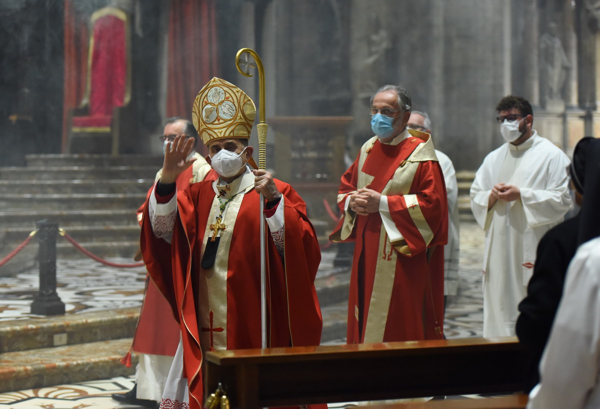 Poi, le litanie dei Santi cantate in ginocchio dall’Arcivescovo, dai concelebranti e dall’assemblea, la liturgia eucaristica e, al termine della celebrazione, ancora un pensiero. «Questa, del Sacro cuore, è la sera adatta per fissare lo sguardo su Gesù e per riconoscere la salvezza. Da lì è venuta l’acqua viva che zampilla per la vita eterna; questa è la sera adatta per ricordare tutti i nostri morti, per pregare con e per loro».