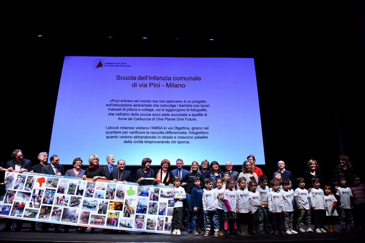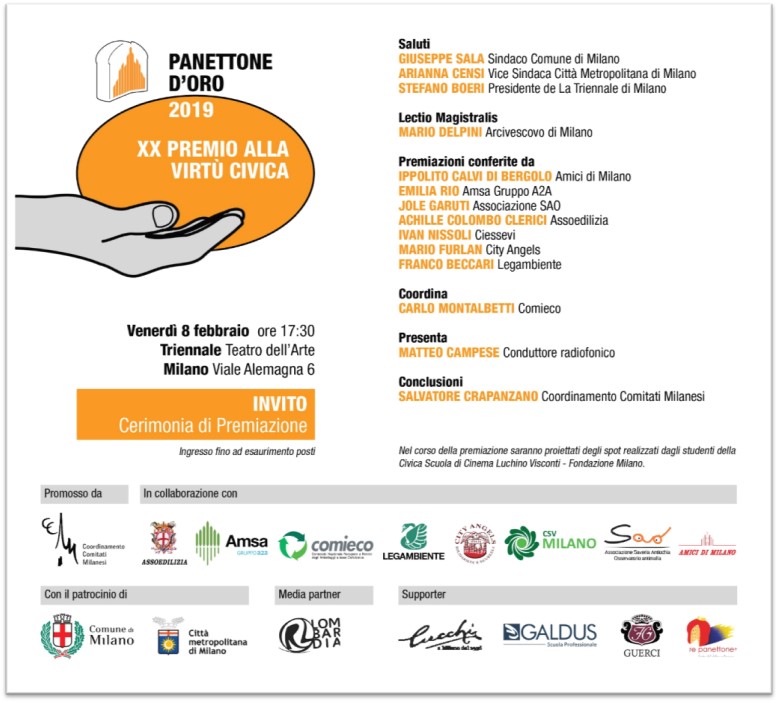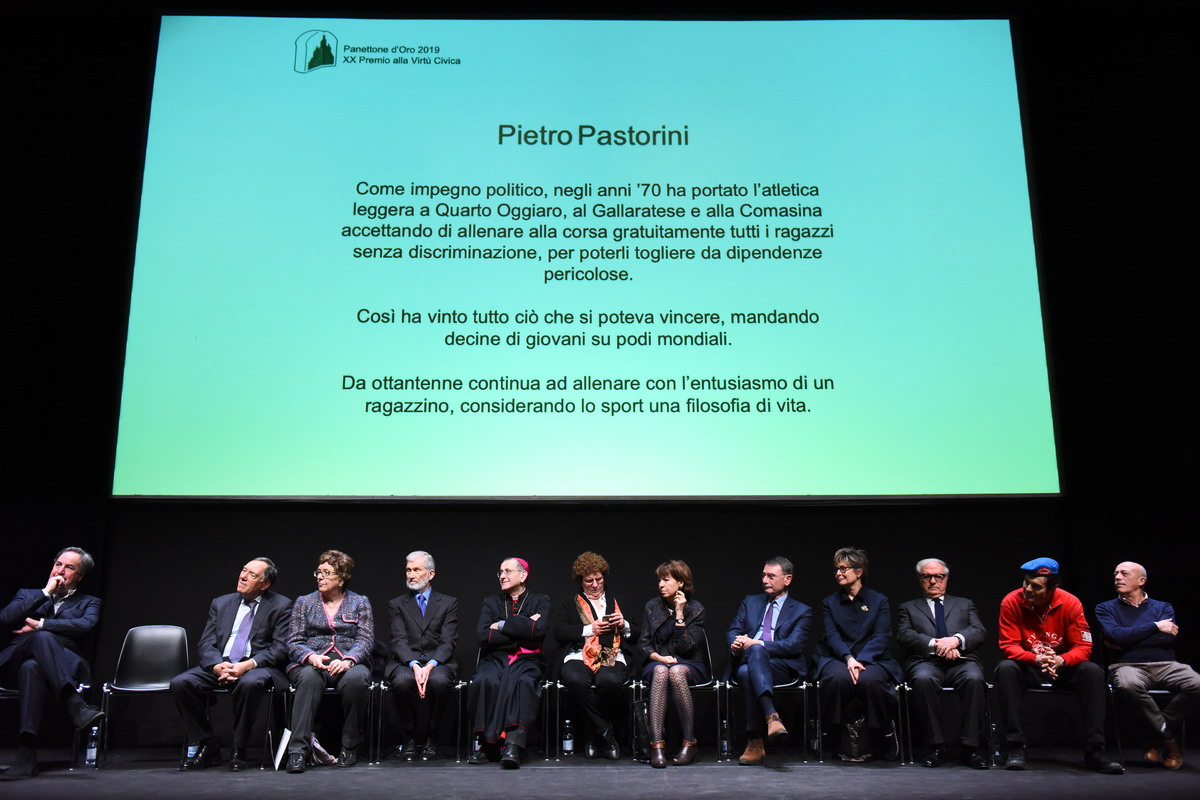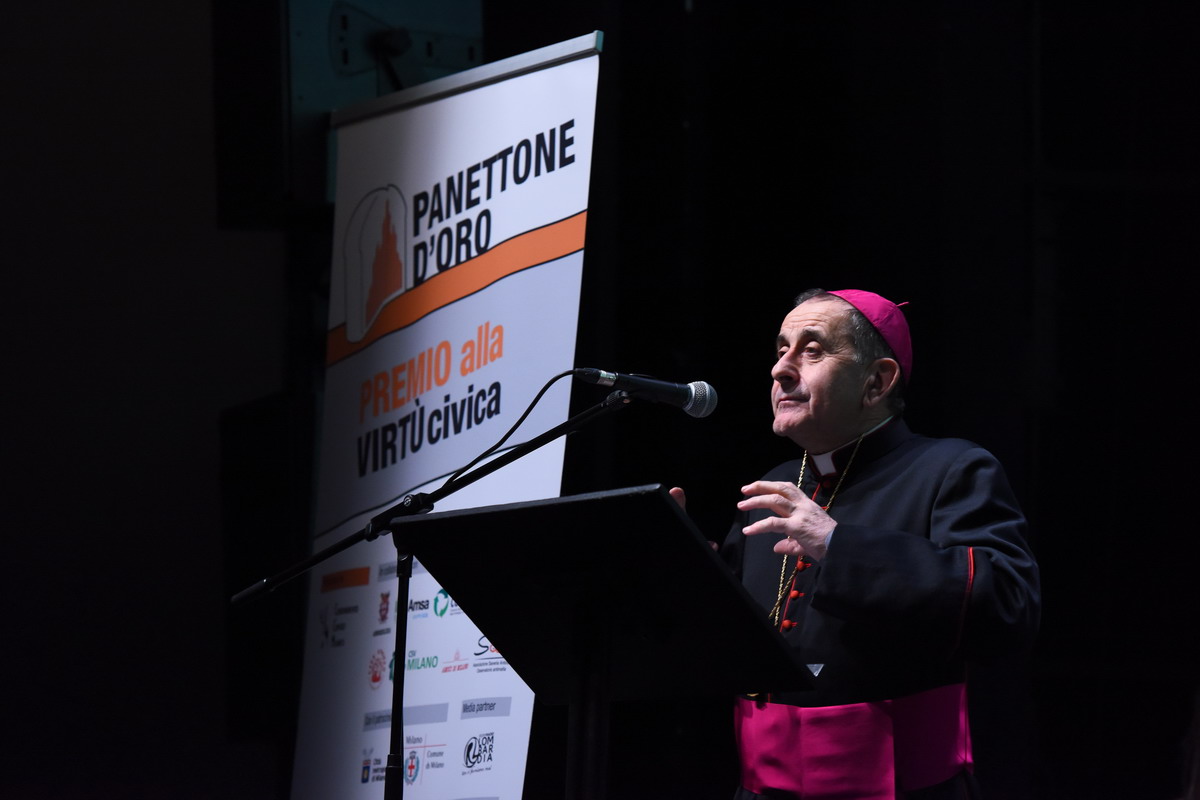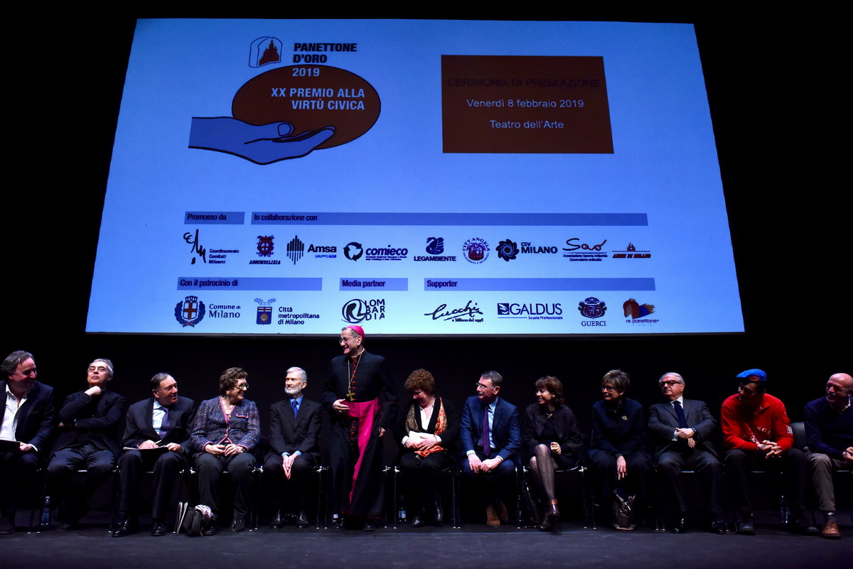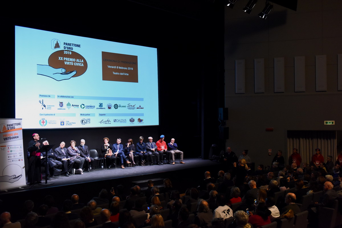 È un intervento appassionato quello che l’Arcivescovo pronuncia, presso un gremito “Teatro dell’Arte”, all’interno della Triennale di Milano, per la cerimonia di Premiazione dei “Panettoni d’oro 2019”. Giunto alla sua XX edizione, il Premio “alla virtù civica” – ideato a metà degli anni ’90 dal Coordinamento dei Comitati Milanesi -, è un appuntamento importante per Milano e il suo territorio metropolitano e vede, infatti, il sostegno di diverse Associazioni e Istituzioni, i cui responsabili e rappresentanti (tra cui la vicesindaco alla Città Metropolitana, Arianna Censi e diversi sindaci), premiano 15 cittadini per ciò che hanno saputo creare nel mondo del volontariato e dell’inclusione sociale. Riconoscimenti cui si aggiungono 15 menzioni speciali per altrettante realtà. Sul paco passano, così, persone e iniziative diverse, tra loro ci sono anche don Claudio Galimberti, «per il grande aiuto portato alla Comunità di Garbagnate Milanese», come si legge nella motivazione del Premio; Gloria Mari alla guida dell’Associazione “Nocetum”, Giovanni Cavedon, presidente del Ceas; tra le Menzioni, l’“Associazione Il Girasole Onlus” che, dal 2006, si impegna per il recupero dei carcerati, «ispirandosi ai principi democratici e ai valori della Caritas Ambrosiana», con la presidente Luisa Bove.