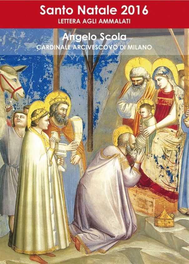 «Vi annuncio una grande gioia… oggi, nella città di Davide, è nato per voi un Salvatore» (Lc 2,10-11). È l’annuncio del Natale per ogni uomo. Anche per gli ammalati. «Chi, infatti, non desidera essere salvato, cioè guarito dal profondo della sua persona, soprattutto quando è ferito dalla malattia? La malattia spezza ogni nostra arroganza e presunzione e ci mette a nudo». Così scrive l’Arcivescovo, cardinale Angelo Scola, nella lettera agli ammalati per il Santo Natale 2016 confezionata in un pieghevole pubblicato dal Centro Ambrosiano e disponibile in libreria (euro 0.20). L’immagine a colori sul frontespizio è la riproduzione di un affresco della Cappella degli Scrovegni a Padova, l’Adorazione dei Magi di Giotto.