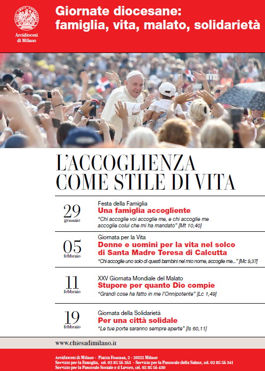 «L’accoglienza come stile di vita» è lo slogan scelto dalla Diocesi per accompagnare le quattro Giornate che si celebrano tra gennaio e febbraio: Famiglia, Vita, Malato, Solidarietà.