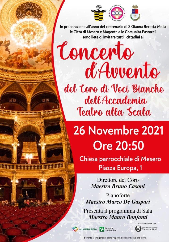Venerdì 26 novembre, alle 20.50, nella chiesa parrocchiale di Mesero (piazza Europa 1), si terrà il «Concerto d’Avvento del Coro di Voci Bianche dell’Accademia Teatro alla Scala», organizzato nell’ambito degli eventi di preparazione all’Anno Centenario della nascita di Santa Gianna Beretta Molla (16 maggio 2022 – 28 aprile 2023).