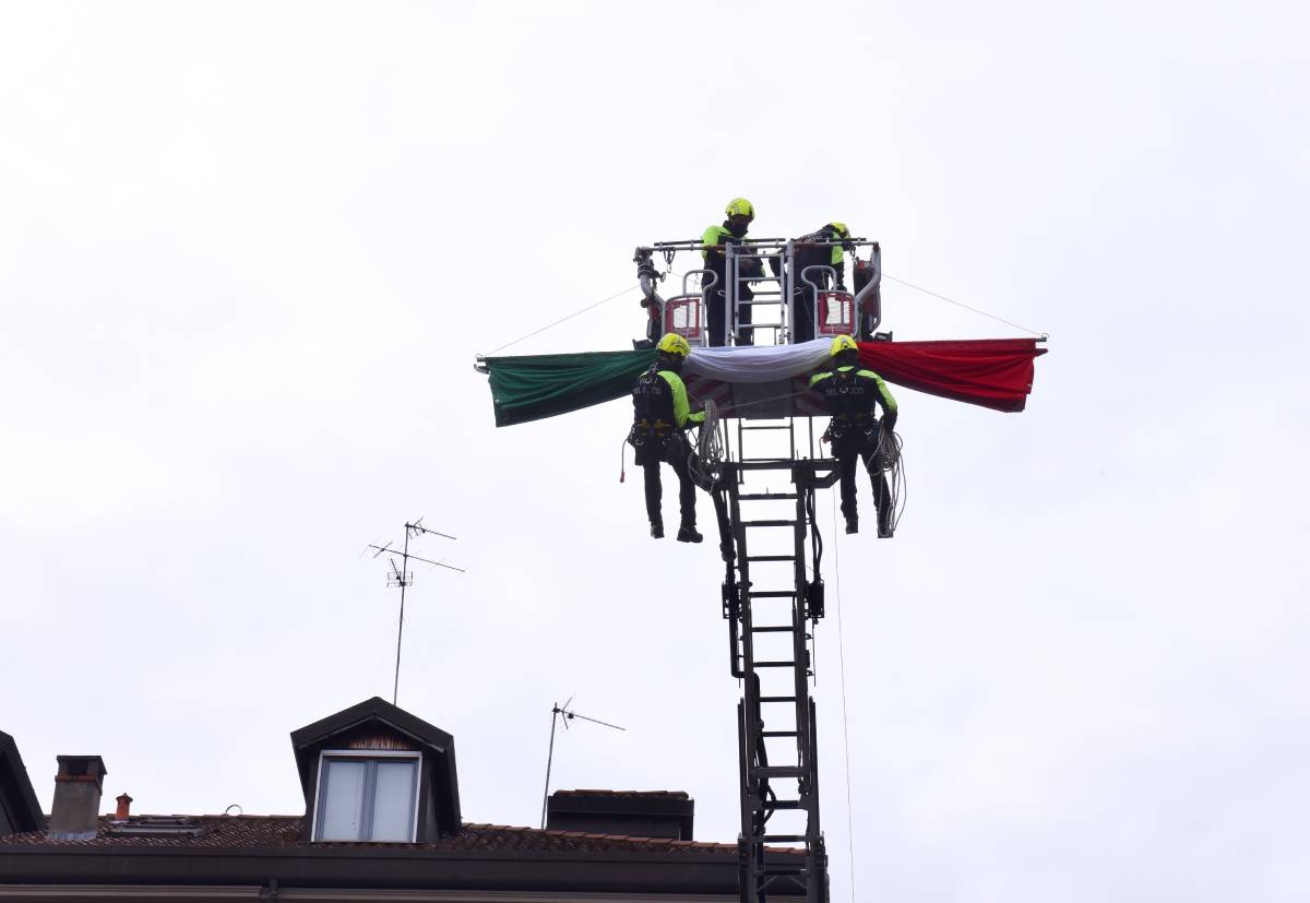La gratitudine e la riconoscenza, che diventano palpabili nell’applauso spontaneo di tanti cittadini, anche semplicemente di passaggio, al momento in cui, sulle note dell’Inno d’Italia, 2 Vigili del Fuoco si calano da 20 metri di altezza, dispiegando un grande tricolore.