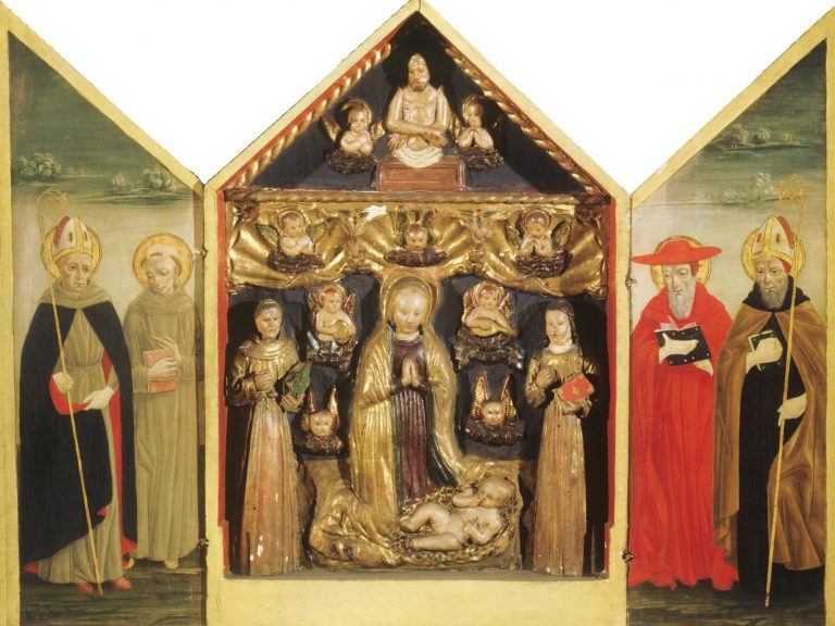 Nella lettera, una splendida riproduzione artistica, che può essere conservata appoggiata sul comodino come un’icona: l’Adorazione del Bambino con i santi Antonio da Padova e Chiara e angeli, un trittico con bassorilievo conservato presso la Quadreria arcivescovile.
