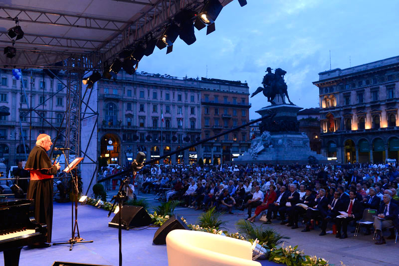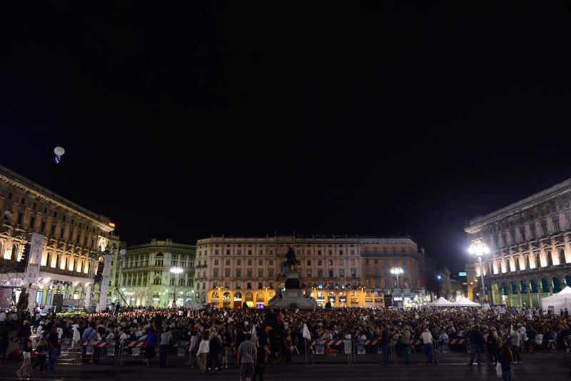 Tre ore di festa e coinvolgimento popolare (aperto da decine di palloncini bianchi liberati nell’aria ancora con la luce del giorno di fronte al Duomo, uno spettacolo sempre emozionante), ma anche una testimonianza di fede e spettacolo, per ritrovare il senso del vivere comune attraverso la riproposizione del Decalogo quale “codice etico” di tutte le legislazioni civili e democratiche. La “rilettura” dei Comandamenti, inaugurata a Roma lo scorso 8 settembre 2012 alla vigilia del Sinodo sulla Nuova Evangelizzazione e dell’Anno della Fede indetto da Benedetto XVI e che già aveva fatto tappa a Napoli e Verona, nella tappa a Milano ha concentrato l’attenzione sul III, “Ricordati di santificare le feste”, vivacizzato dalla band DieciperDieci del RnS (ensemble con un totale di 120 elementi, un terzo dei quali presenti sul palco meneghino).