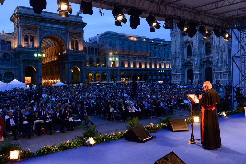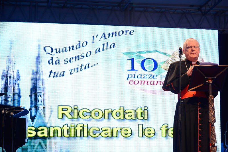 «Qui è in gioco qualcosa che riguarda in profondità l’esperienza umana: nessun uomo in ogni tempo e luogo può fare a meno del riposo. Questo fatto ci dice che non siamo onnipotenti». Lo ha detto l’Arcivescovo, cardinale Angelo Scola, alla festa in Piazza Duomo alla manifestazione svoltasi sabato sera in Piazza Duomo a Milano, nell’ambito di “10 Piazze per 10 Comandamenti”, organizzato dal movimento ecclesiale Rinnovamento nello Spirito Santo (che in Italia conta più di 200 mila aderenti, raggruppati in quasi duemila gruppi e comunità), in collaborazione con il Pontificio Consiglio per la Promozione della Nuova Evangelizzazione e sotto l’egida della Cei.