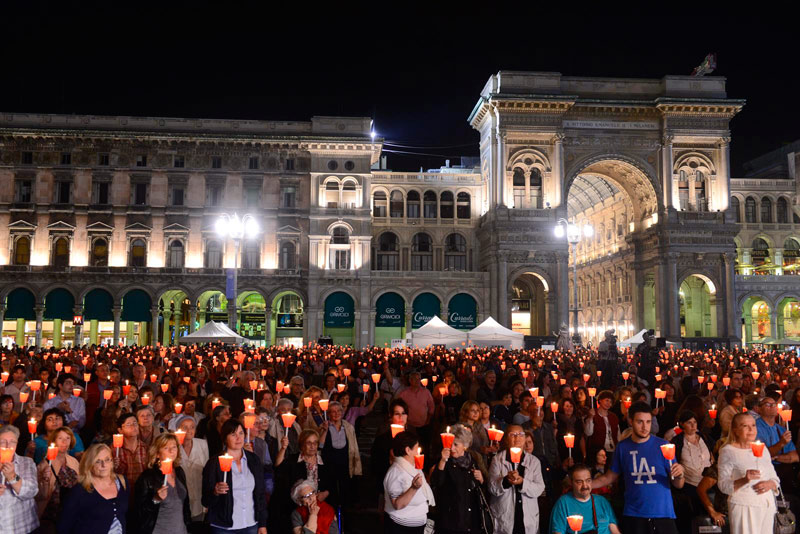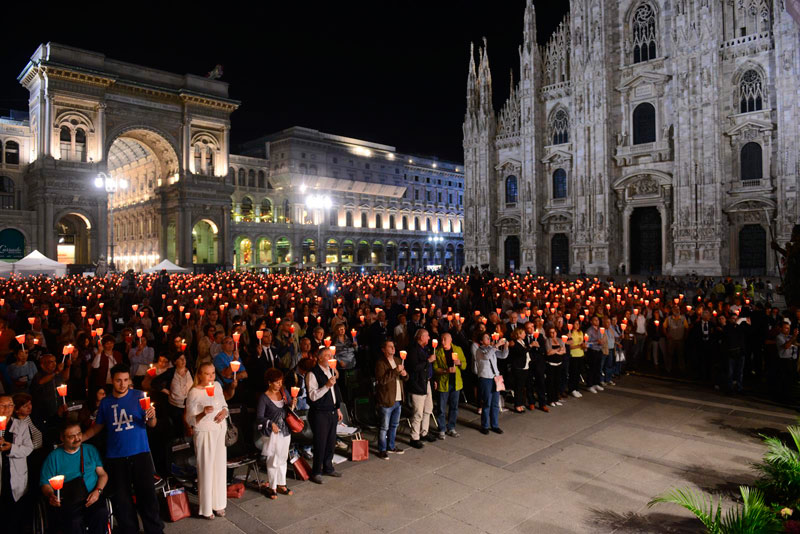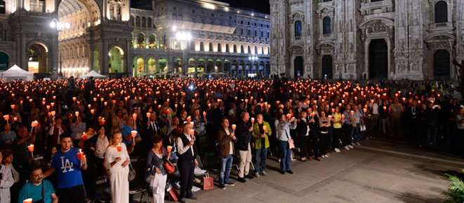 Dopo l’intervento di Sergio Macorini (imprenditore e titolare di una gioielleria in città, che ha scelto di tenere chiuso alla domenica), il presidente nazionale del RnS, Salvatore Martinez, ha chiuso la serata invitando a riscoprire la domenica non come ultimo giorno della settimana ma come il primo della settimana entrante, mentre letture finali sull’argomento (tratte da sant’Ambrogio e san Carlo Borromeo) accompagnavano una spettacolare distesa di fiaccole accese dai fedeli in tutta Piazza Duomo.