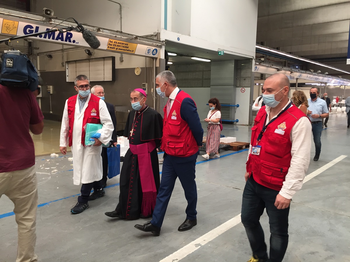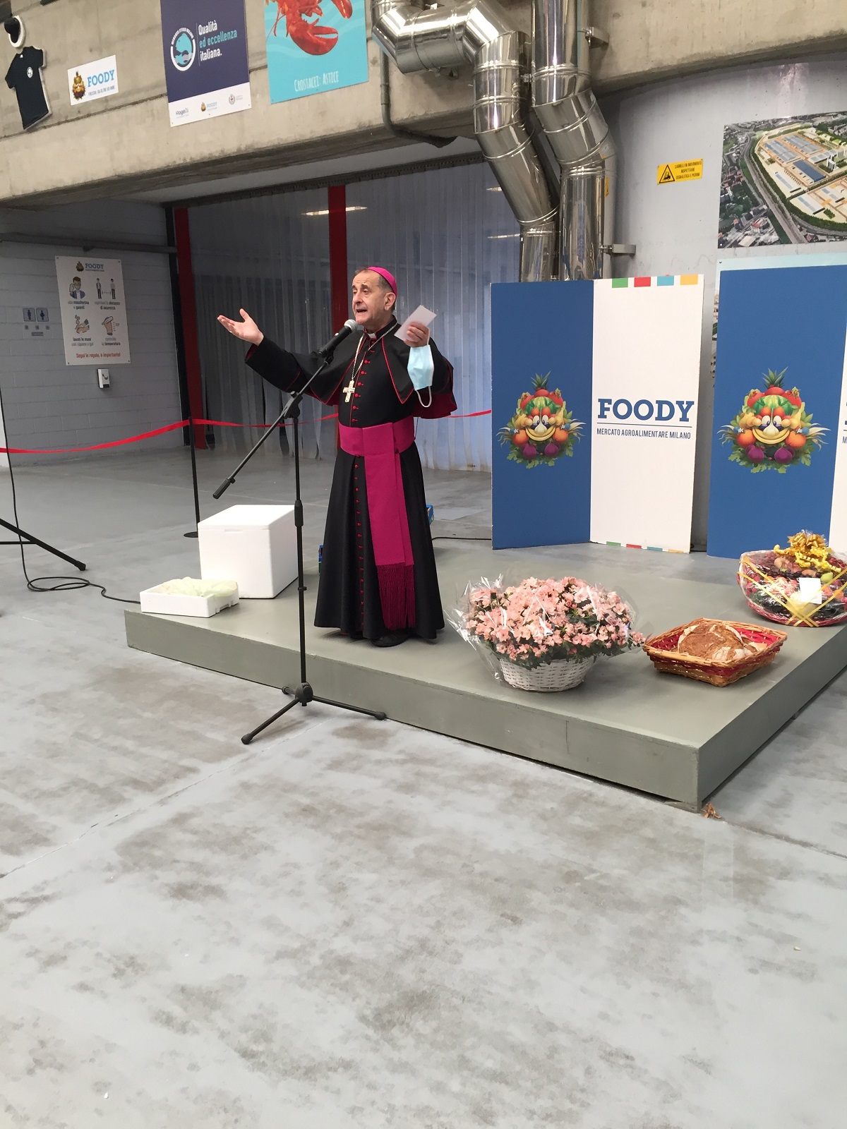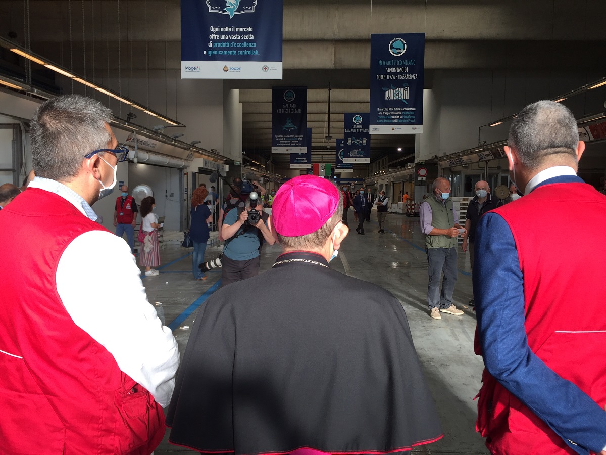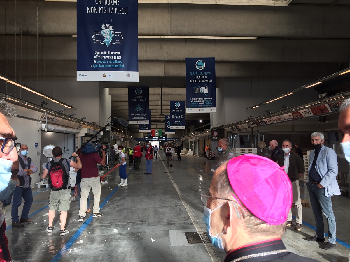 Un palchetto, nel corridoio pedonale, attende, monsignor Delpini. La prima parola è di gratitudine: «Desidero ringraziare – esordisce -. Prendere coscienza, personalmente, di quanta gente consente alla città e a tutto il territorio, di apprezzare i frutti della terra e del mare. Mentre la gente riposa, voi lavorate. Questo vivere un po’ al contrario può essere anche un problema per la vita familiare, sociale, ecclesiale. Sono qui a dire la mia solidarietà e il mio apprezzamento per i sacrifici che qui si fanno, per offrire le cose migliori che possiamo raccogliere».