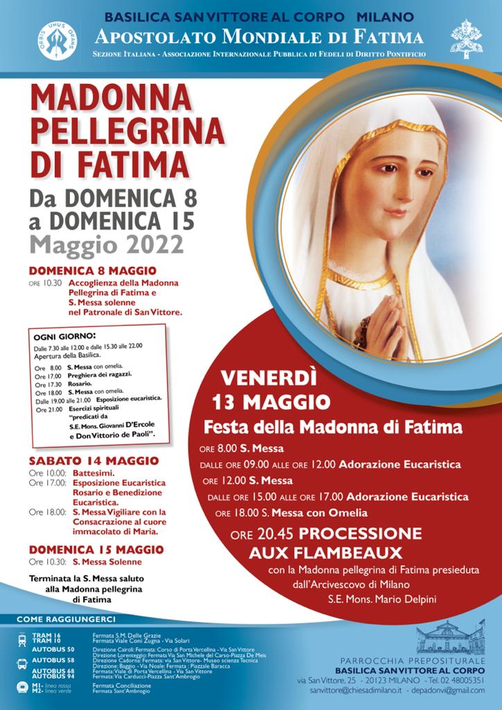 Il mese di maggio è dedicato alla Madonna e la devozione a Maria è cara a tanti fedeli ambrosiani. Tra i vari appuntamenti possibili si segnala che, da domenica 8 a domenica 15 maggio, si terranno celebrazioni ed eventi per la Madonna pellegrina di Fatima, ora collocata nella Basilica di San Vittore al Corpo a Milano (vedi qui la locandina). È prevista anche la presenza dell’arcivescovo Mario Delpini, che presiederà la processione aux flambeaux in programma venerdì 13 maggio alle 20.45 con partenza dalla Basilica (piazza San Vittore 25, Milano).