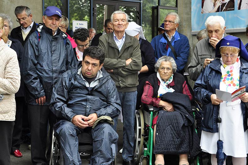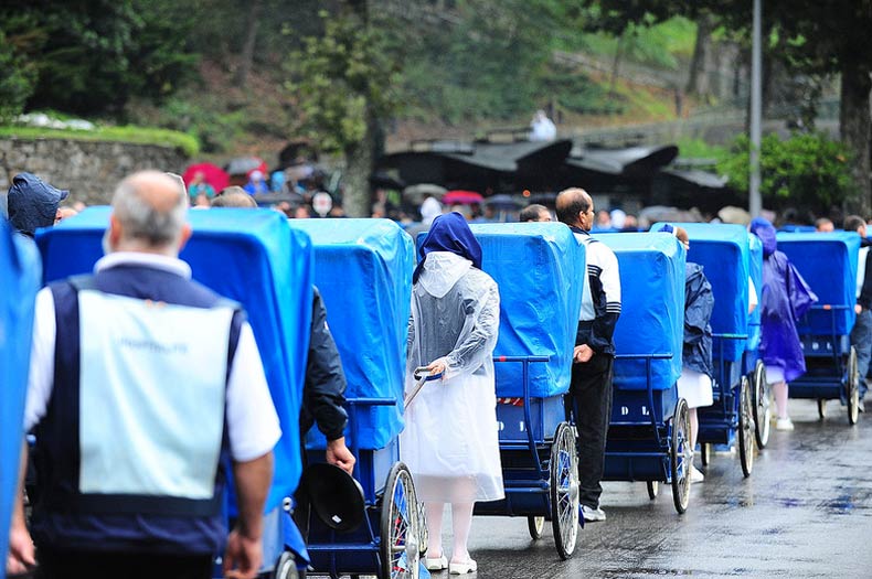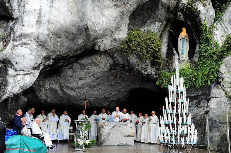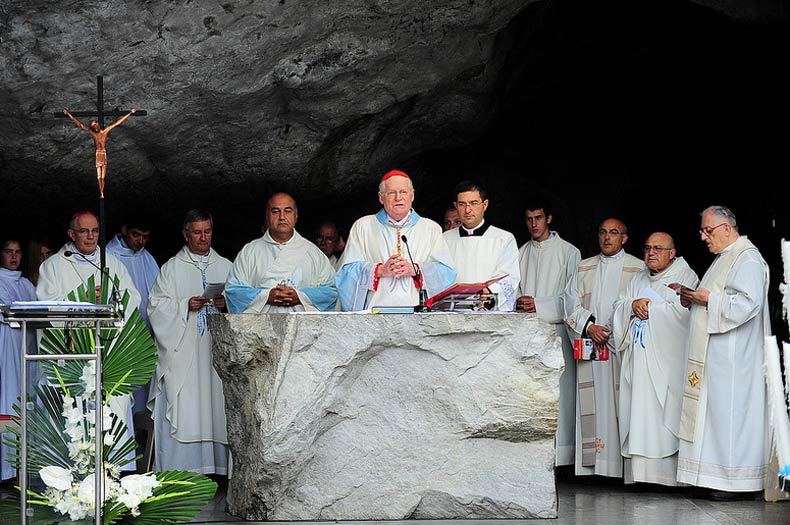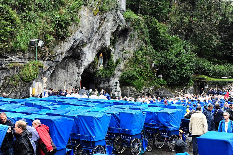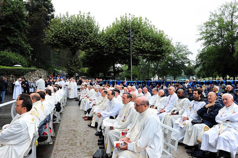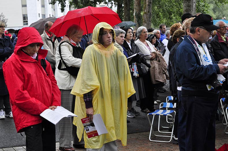 La pioggia fine che bagna Lourdes dalla notte si interrompe alle 9.40, a pochi minuti dall’inizio della Messa. Consentendo alle centinaia di infermi di piegare i tettucci delle carrozzine (se ne contano oltre 500 tra risció e sedie a rotelle), chiudere gli ombrelli e riporre le coperture anti pioggia. Sono tutti davanti alla Grotta per partecipare alla celebrazione eucaristica presieduta dal cardinale Scola. Più vicini gli ammalati, mentre il resto dei pellegrini trova spazio al di là del fiume Gave, proprio di fronte alla grotta teatro della prima apparizione di Maria, l’11 febbraio 1858.