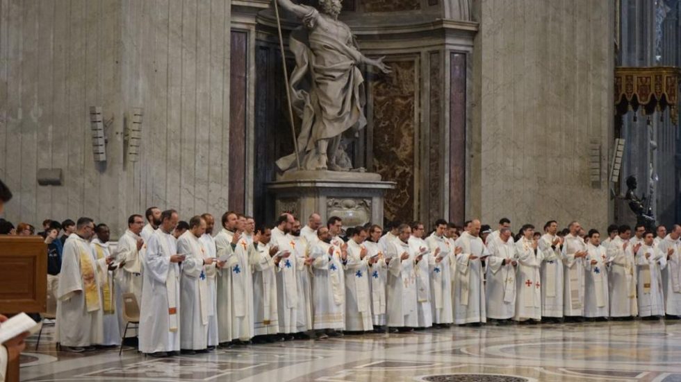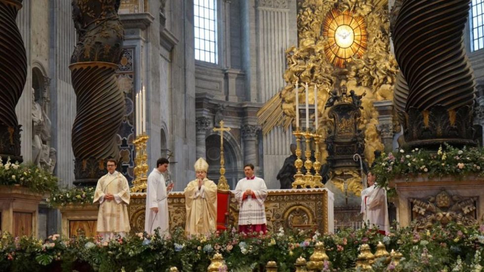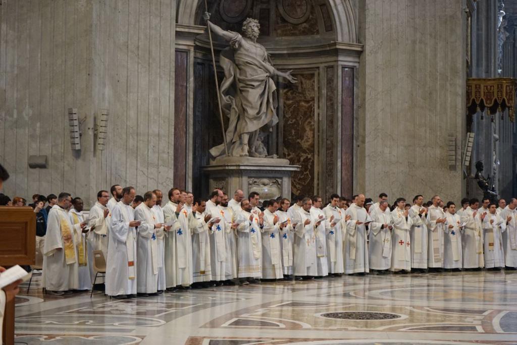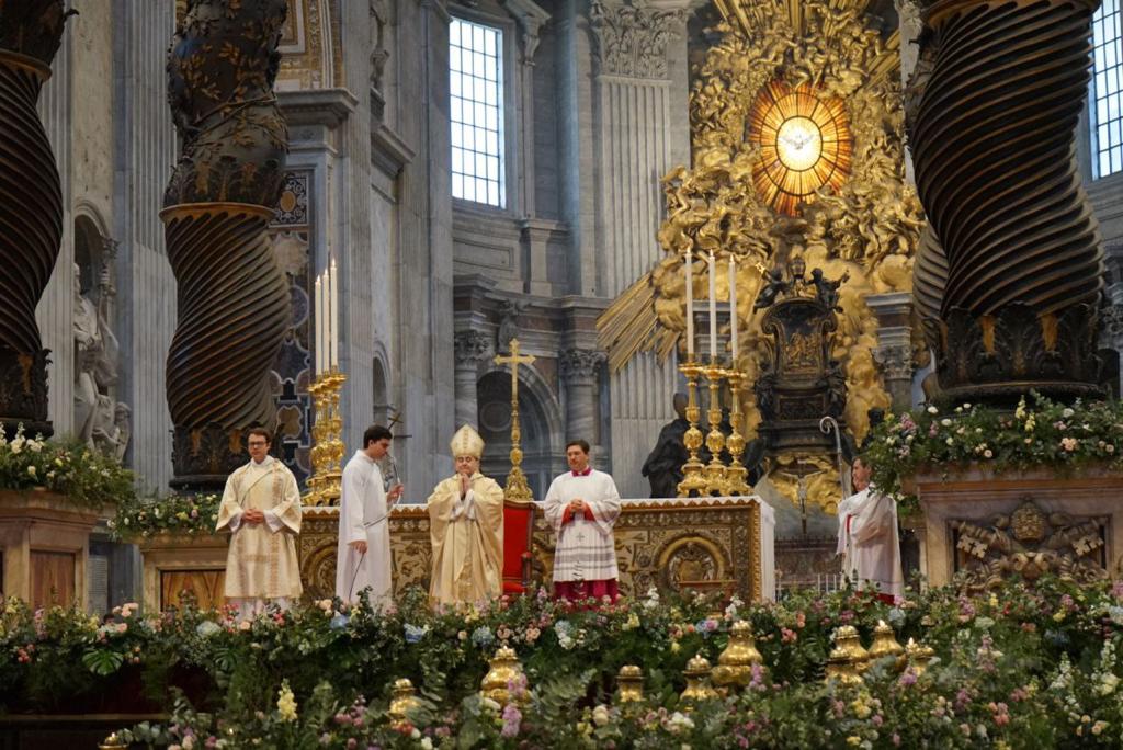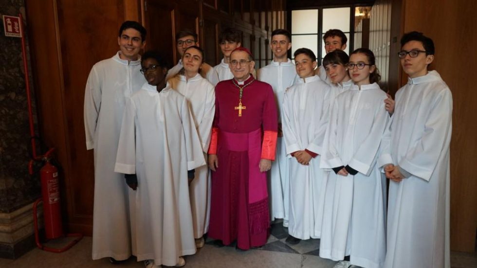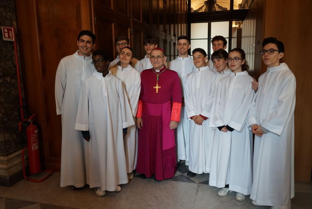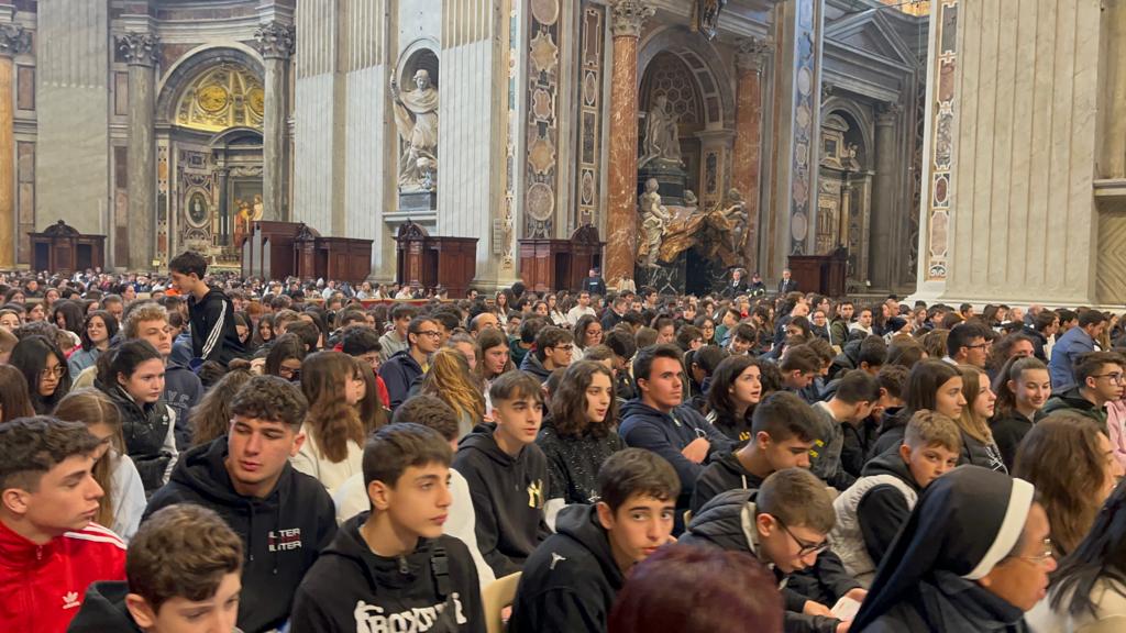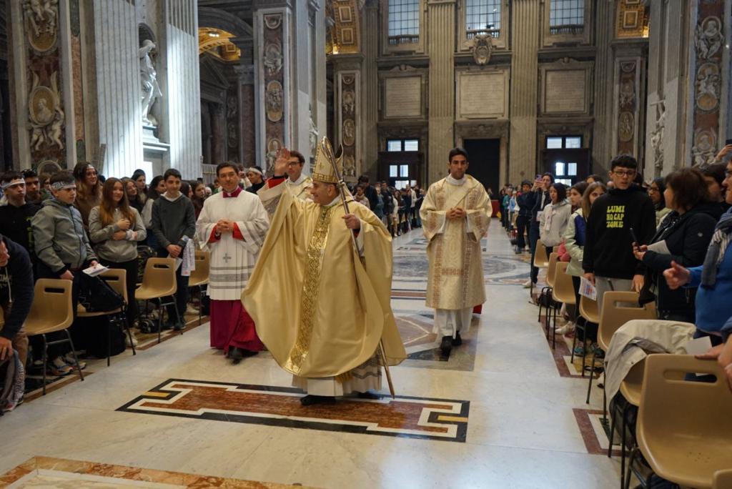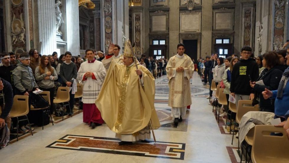 Tutti insieme in una marea coloratissima, fatta di bandiere, bandane e striscioni, che saluta l’Arcivescovo in arrivo sotto il colonnato del Bernini, accompagnato da don Mario Antonelli, Vicario episcopale di settore. La stessa massa che però, una volta in Basilica, partecipa alla Messa – concelebrata da circa 200 sacerdoti tra cui don Michele Falabretti, responsabile del Servizio nazionale per la pastorale giovanile – con attenzione e raccoglimento. Accogliendo l’Arcivescovo, come chiede il direttore della Fom don Stefano Guidi, con un Kaire corale urlato a pieni polmoni.
