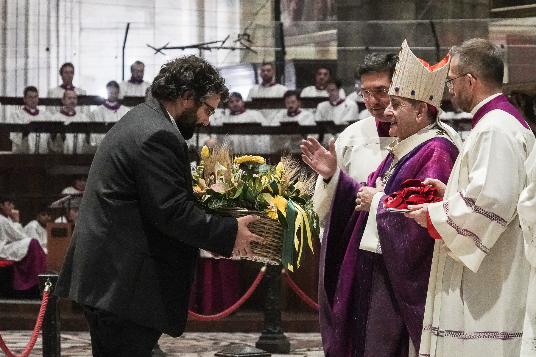 Poi la consegna fisica del volume nelle mani dell’Arcivescovo che, dalla sua Cattedra, lo mostra ai fedeli riuniti nelle navate, tra cui la presidente del Consiglio comunale Elena Buscemi con la fascia tricolore in rappresentanza del sindaco di Milano, Beppe Sala, i vertici provinciali e regionali della Coldiretti con tanti associati, poco prima già incontrati dal Vescovo presso il Farmer’s market allestito per la Giornata del Ringraziamento presso la Loggia dei Mercanti con i prodotti a filiera corta. Presenti in Duomo, come tradizione, anche i membri dell’Arciconfraternita del Santissimo Sacramento del Duomo, di altre Confraternite diocesane, dell’Ordine di Malta e del Santo Sepolcro.