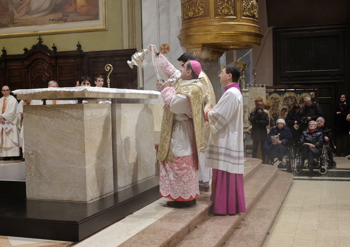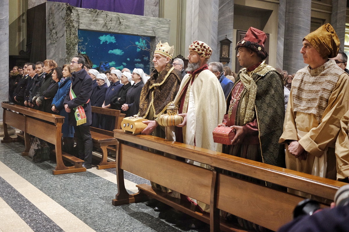 Nella grande chiesa di San Bartolomeo, cuore di Brugherio, la Celebrazione iniziata con la processione dei figuranti in costume che interpretano i Magi e l’omaggio presso le reliquie dei tre sapienti di Oriente è, come sempre – ancora di più in questa Eucaristia vigilare dell’Epifania 2018 presieduta dall’Arcivescovo –, il simbolo della devozione di una terra dalle profonde radici cristiane e, insieme, il segno di una Comunità pastorale che cammina anch’essa seguendo la stella che illumina. Comunità, popolo di Dio che si affolla per la festa sentitissima tanto che alla CP avviatasi il 1 settembre 2009 e che riunisce le 4 parrocchie cittadine, per volere unanime dei brugheresi, è stato dato il nome di “Epifania del Signore”. Quel 6 gennaio alla cui Vigilia, la Messa è, dunque, particolarmente solenne, come ha testimoniato, per limitarsi solo agli ultimi anni, la presenza dei cardinali Tettamanzi, Scola, Coccopalmerio e, adesso, di monsignor Delpini.Tutti, insomma, intorno alle venerate reliquie che la tradizione fa risalire addirittura ad epoca santambrosiana, quando il santo vescovo Ambrogio le donò alla sorella Marcellina, la quale, a sua volta, conservò i tre piccoli frammenti ossei nella villa sita tra Brugherio e Carugate, divenuta in seguito monastero. Attestata, invece, l’esistenza delle reliquie in San Bartolomeo fin dal 1500, conservate, dal primo decennio del ‘600, in un prezioso reliquiario argenteo rappresentante le piccole figure dei Magi, i tre “ometti”, definiti in dialetto, “umitt”. Teca che, al termine della Messa, viene posta sull’altare maggiore per il rito, appunto, di «baciare gli umitt».