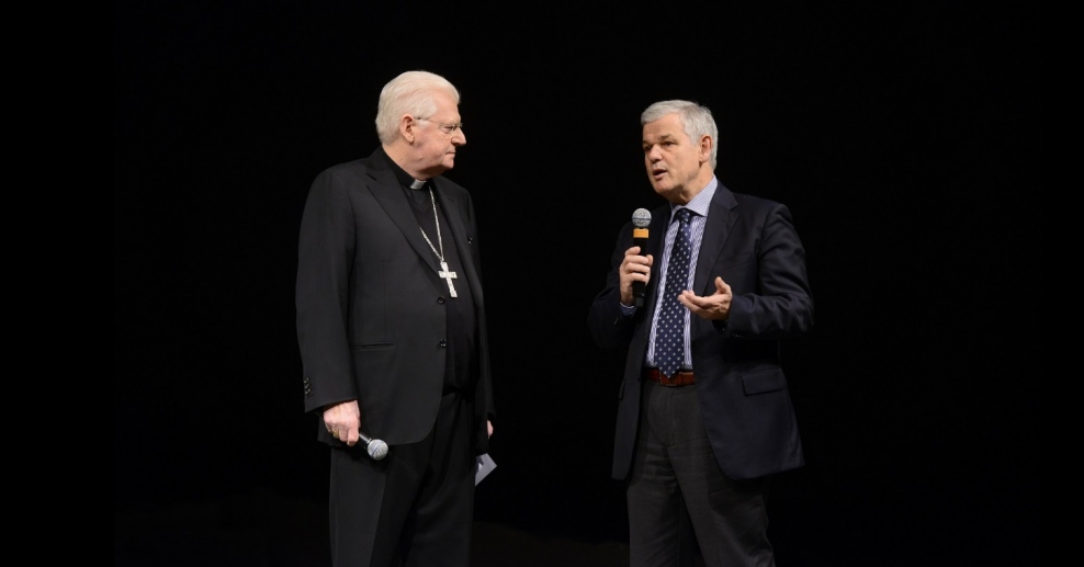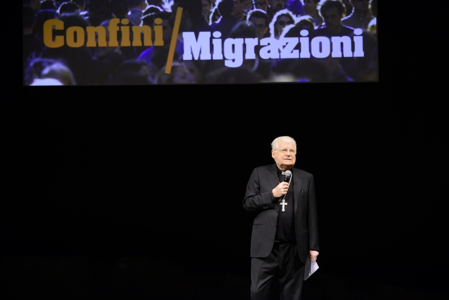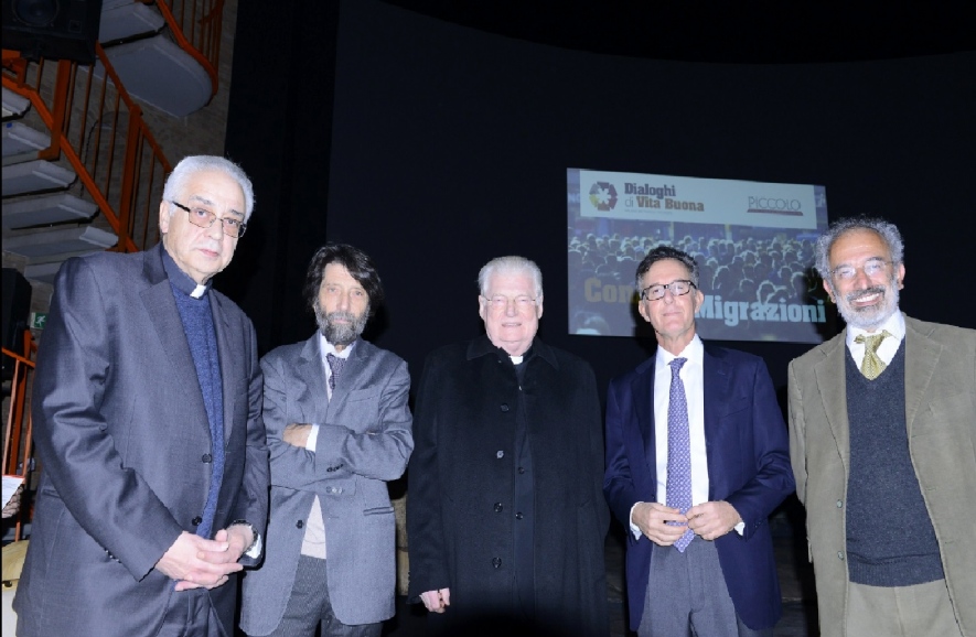 «Come accade spesso, le cose belle della vita accadono, non si decidono a tavolino, così è per stasera, dove uomini di diverse mondovisioni, appassionati del proprio tempo e di Milano si sono incontrati per confrontarsi, per lasciarsi narrare e narrarsi, in modo da raggiungere un riconoscimento possibile e da incontrare la nostra città, in questo tempo decisivo e di grande prova. Un’unità nata per raccordare i mille aspetti dello sviluppo di una metropoli dal carattere plurale. Un’unità fatta, quindi, di reciproca narrazione per trovare strade di vita buona a partire dal bene sociale del vivere insieme. Viviamo questa serata senza nessun principio di autorità, nessuna appropriazione di tale gesto se non da parte di tale Comitato scientifico che se ne è assunta la responsabilità. Speriamo in un lavoro che si articoli, poi, su tutto il territorio almeno delle terre ambrosiane. È un contributo per avere e costruire il futuro». Le parole del cardinale Angelo Scola – semplici, ma che chiariscono subito il significato del primo incontro dell’iniziativa dei “Dialoghi di Vita Buona”, dedicato al tema “Confini-Migrazioni” – aprono l’evento atteso che si svolge presso il Piccolo Teatro Studio Melato con la partecipazione di tanta gente.