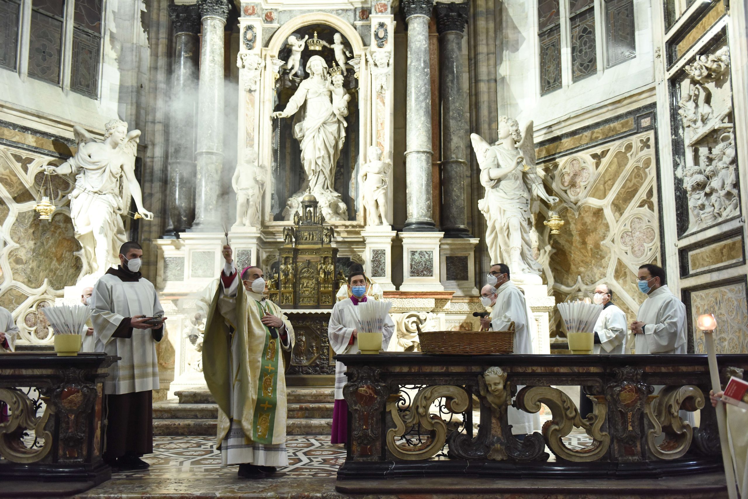 La processione dei concelebranti, delle rappresentanti della Vita Consacrata femminile e dei Fratelli oblati con le candele che muove dall’altare della “Madonna dell’Albero”, portando tra i fedeli l’icona della “Madonna dell’Idea”; i Dodici Kyrie che risuonano nella Cattedrale dove trovano posto, nel rispetto delle regole antipandemiche, consacrate, consacrati con le loro fiammelle accese. È la Celebrazione per la XXVI Giornata Mondiale della Vita Consacrata, presieduta dall’Arcivescovo, che ricorre nella Festa liturgica della Presentazione del Signore al Tempio – significativamente, in Oriente si chiama Festa dell’incontro -, la “Candelora” della devozione popolare. Oltre 70 i concelebranti, tra cui molti religiosi, tutti i Vescovi ausiliari, alcuni emeriti, cui si aggiunge monsignor Alberto Lorenzelli, ausiliare di Santiago del Cile, membri del Cem e i Canonici del Capitolo metropolitano, con l’arciprete, monsignor Gianantonio Borgonovo.