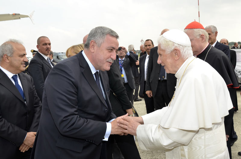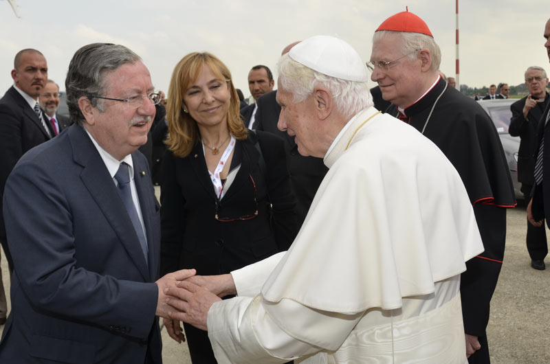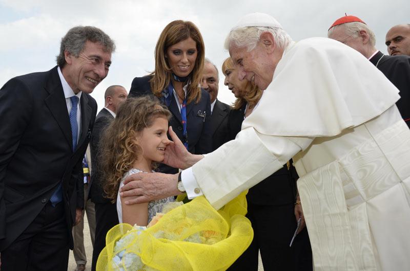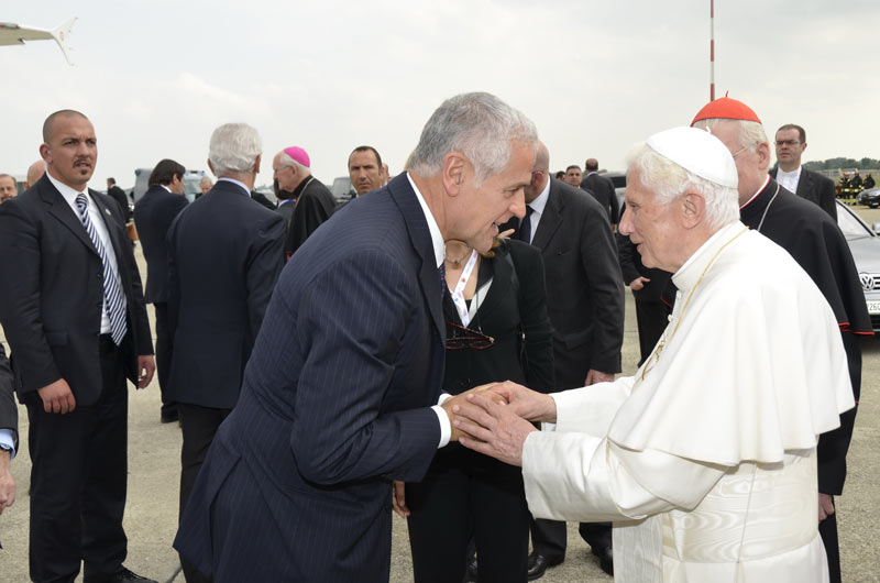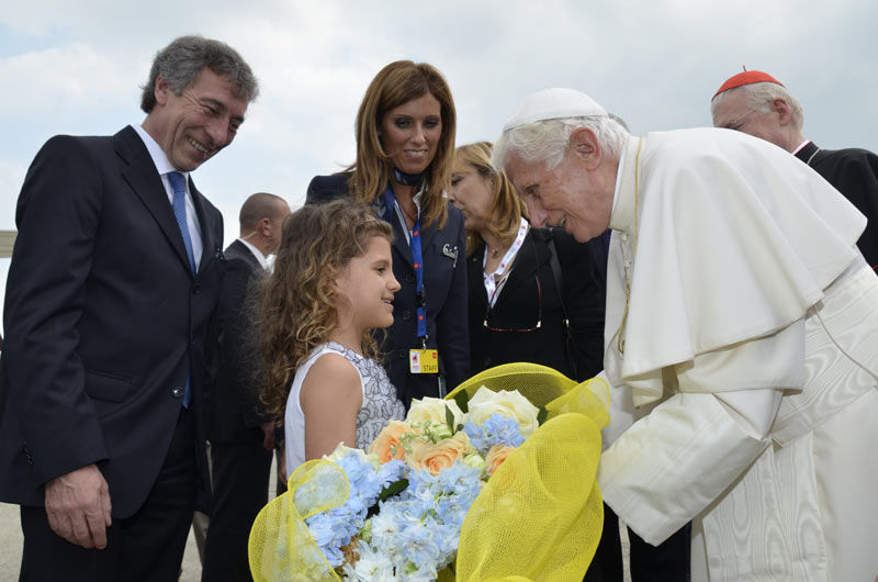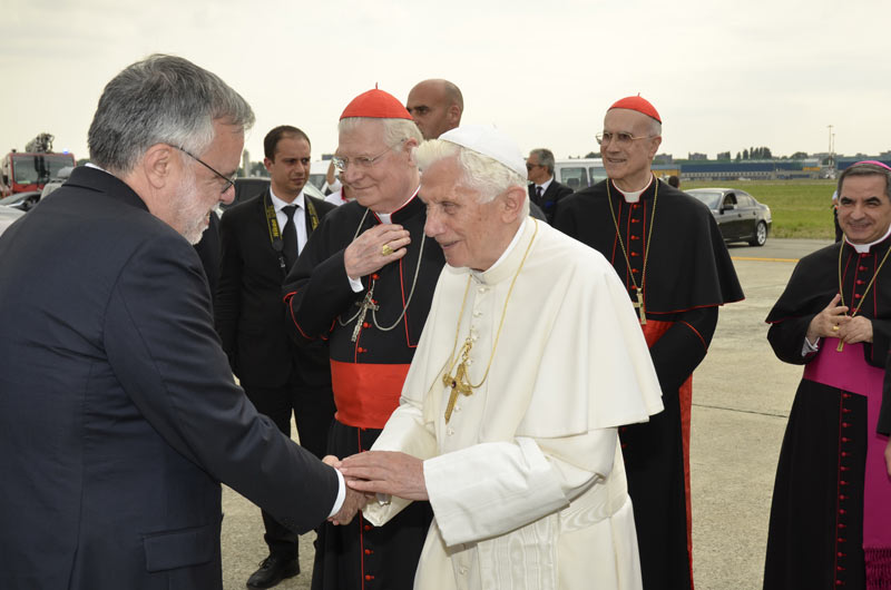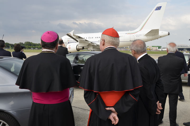 Arrivato a Linate il Pontefice è stato salutato dal corteo papale e dalle autorità presenti: in rappresentanza del Governo il Ministro per la Cooperazione internazionale e l’integrazione Andrea Riccardi, il Sindaco di Milano Giuliano Pisapia, il Presidente della Regione Roberto Formigoni, il Presidente della Provincia di Milano Guido Podestà, il Prefetto Gian Valerio Lombardi, il Questore Alessandro Marangoni e l’Ambasciatore d’Italia presso Santa Sede Francesco Maria Greco.
