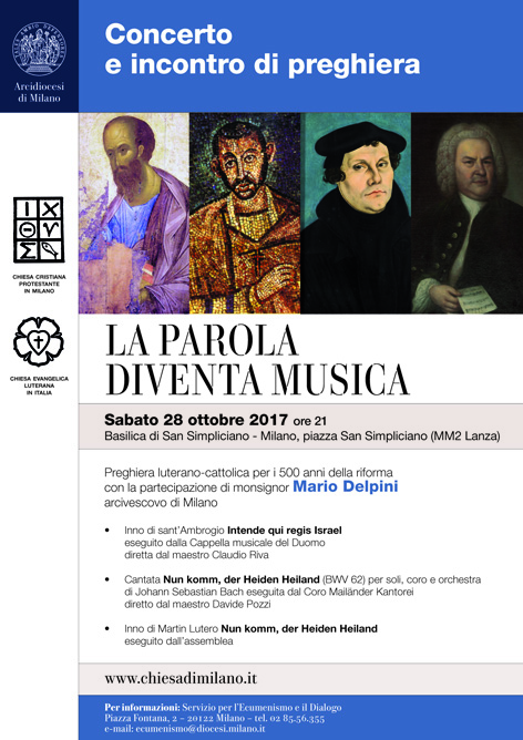 Si chiudono le celebrazioni dei 500 anni della Riforma protestante e Milano, come altre città e diocesi, invita tutti a un momento di preghiera e riflessione da compiere in clima di fraterna comunione tra cattolici e luterani. Un evento ecumenico che lega arte e preghiera è l’incontro dal titolo «La Parola diventa musica», che si terrà sabato 28 ottobre, alle 21, nella Basilica di San Simpliciano a Milano (piazza San Simpliciano 2). La Chiesa cristiana protestante in Milano con la pastora Anne Stempel e la Chiesa evangelica luterana in Italia con la pastora Nora Foeth, in conclusione dell’intenso programma di incontri e iniziative per i 500 anni della Riforma, insieme all’Arcivescovo di Milano, monsignor Mario Delpini, invitano a un incontro di spiritualità ad alto contenuto artistico.
