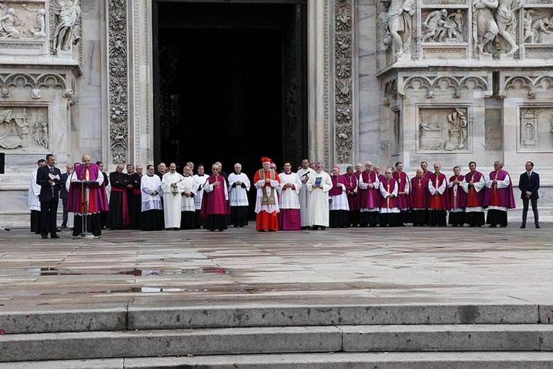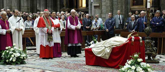 Una folla composta e silenziosa ha riempito la navata centrale del Duomo e si è raccolta in preghiera attorno al cardinale Scola, che ha raccomandato: «Esprimiamo il nostro affetto con la preghiera di suffragio per il nostro amatissimo Arcivescovo». Poi il Cardinale ha invitato al «raccoglimento e all’amicizia fraterna», come pure «al silenzio e alla preghiera». E ha concluso commosso: «Nella memoria viva della sua persona e del suo operare nascerà per noi una più solida fede e una più vivida fraterna amicizia». Quindi l’arcivescovo Scola si è avvicinato alla salma per benedirla e recitare l’Eterno riposo.