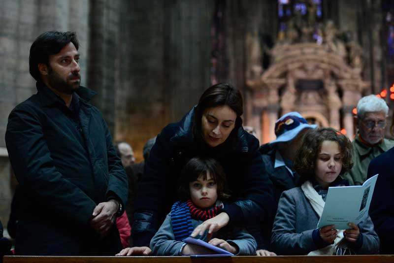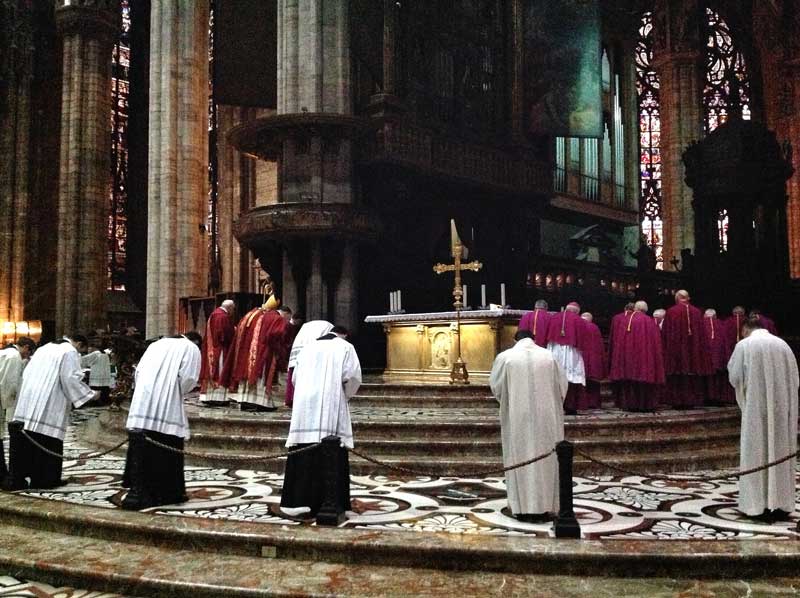 Alle parole "Gesù di nuovo gridò a gran voce ed emise lo spirito", il cardinale si interrompe. Tutto il Duomo si inginocchia. Le luci si spengono. L’altare è spogliato e nascosto da un drappo rosso scuro. Tutto, nella cattedrale buia, porta a pensare a "un’esperienza di dolore e di perdita che sembra irreparabile", dirà il cardinale Angelo Scola nell’omelia.