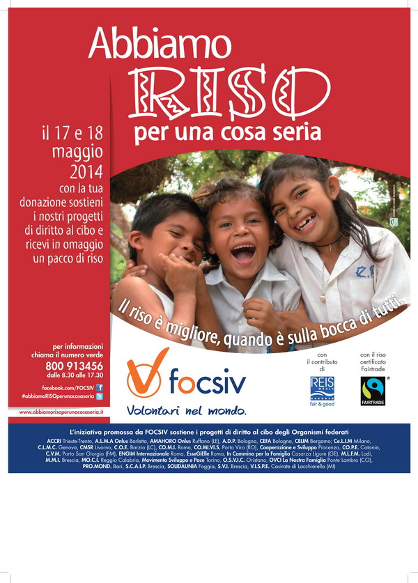 Con la campagna “Abbiamo Riso per una cosa seria” Focsiv vuole condividere con tutti i cittadini che il 17 e il 18 maggio saranno nelle piazze e nelle parrocchie dove saranno ospitati i banchetti della raccolta fondi la sfida dei suoi volontari con le comunità locali contro la fame in 29 villaggi tra l’Africa e l’America Latina. In cambio della donazione sarà offerto un pacco di riso del commercio equo solidale certificato FairTrade.