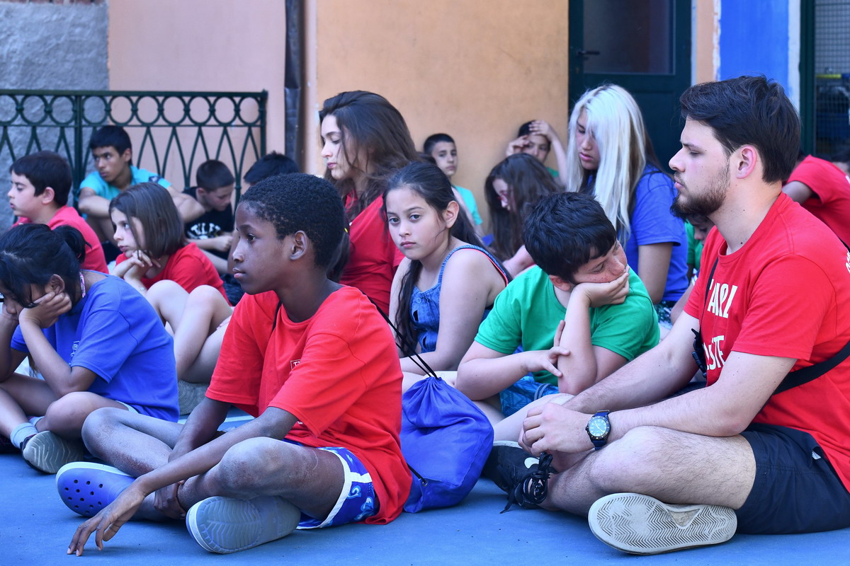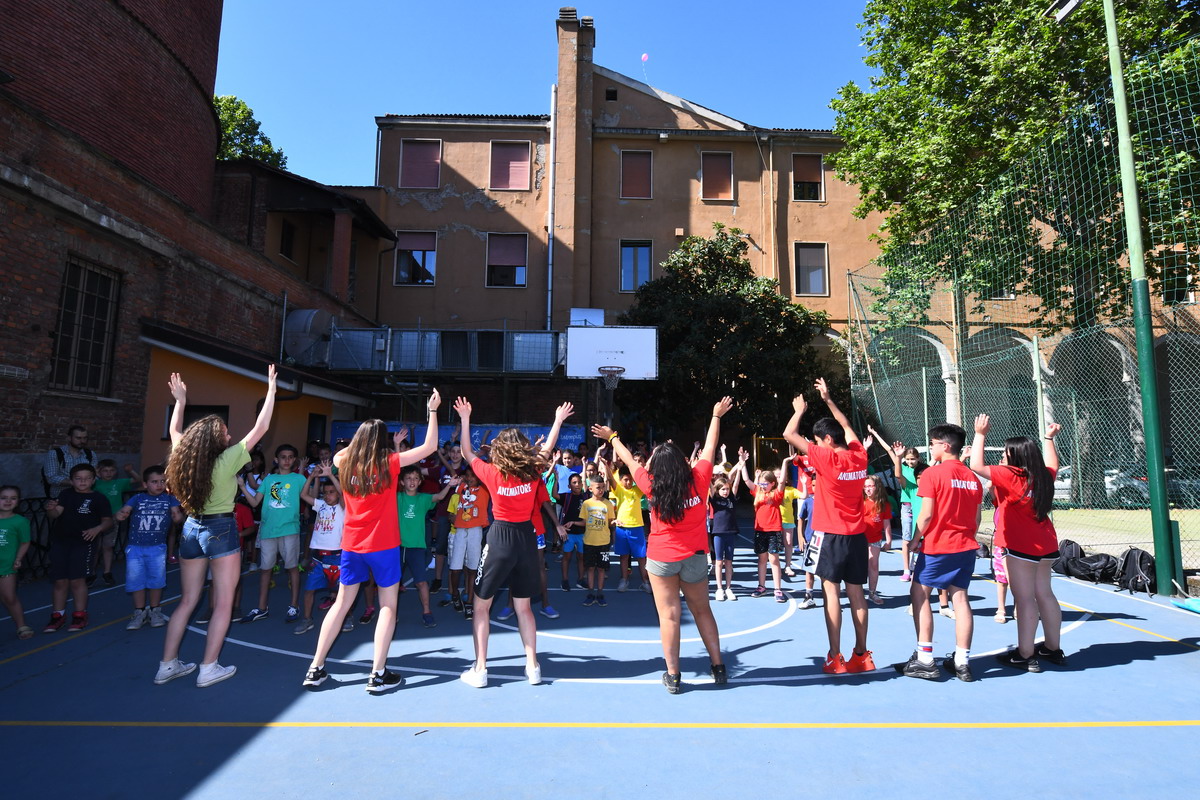 Discorsi che ragazzini e ragazzini, con i loro fratelli e sorelle appena più grandi – gli animatori -, ascoltano in silenzio, semplicemente seduti a terra come accade nel campo di basket dell’oratorio della B.V. Addolorata.