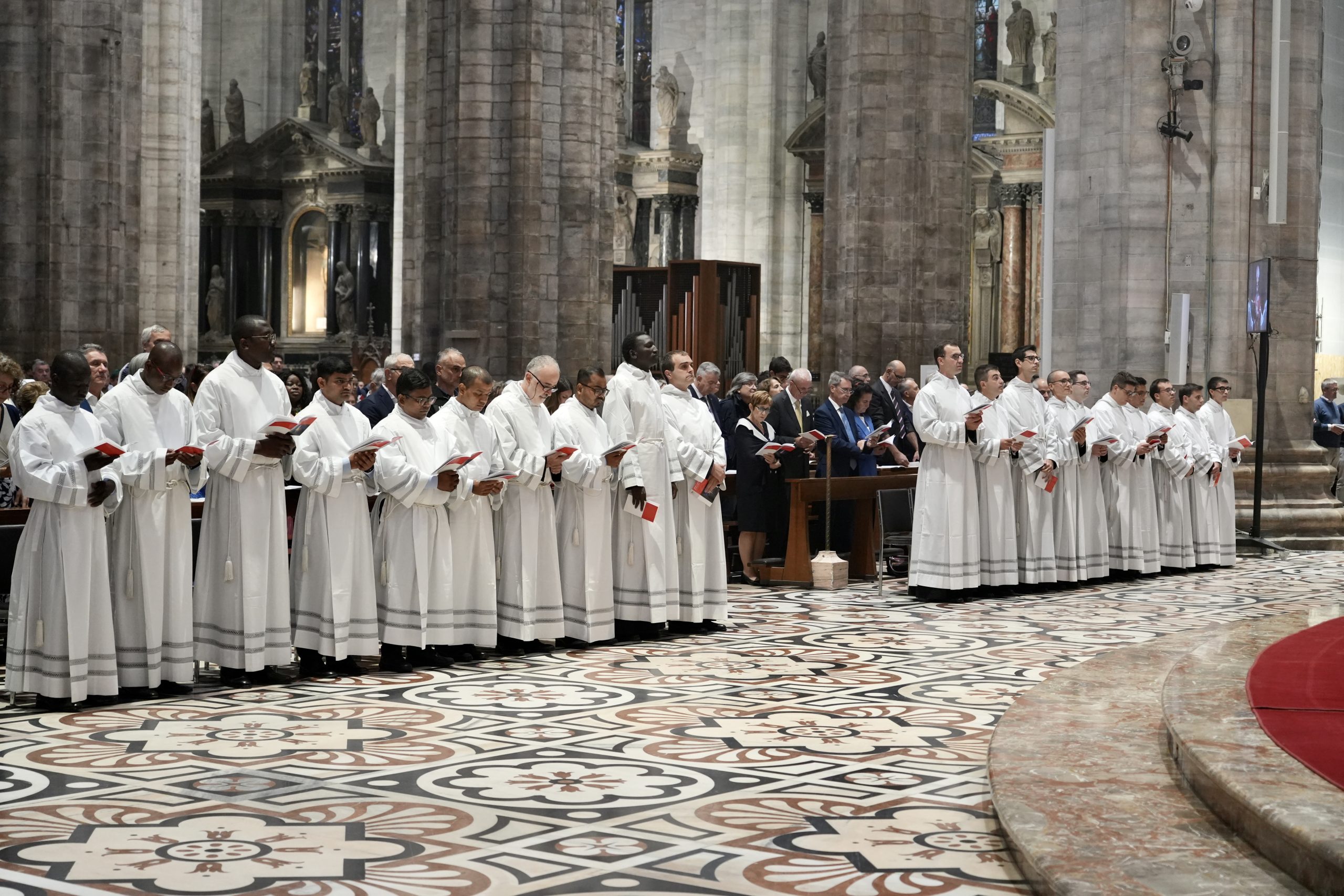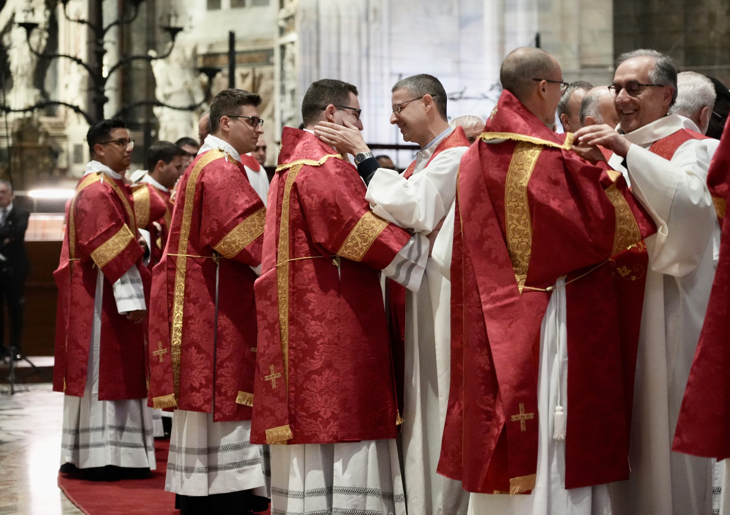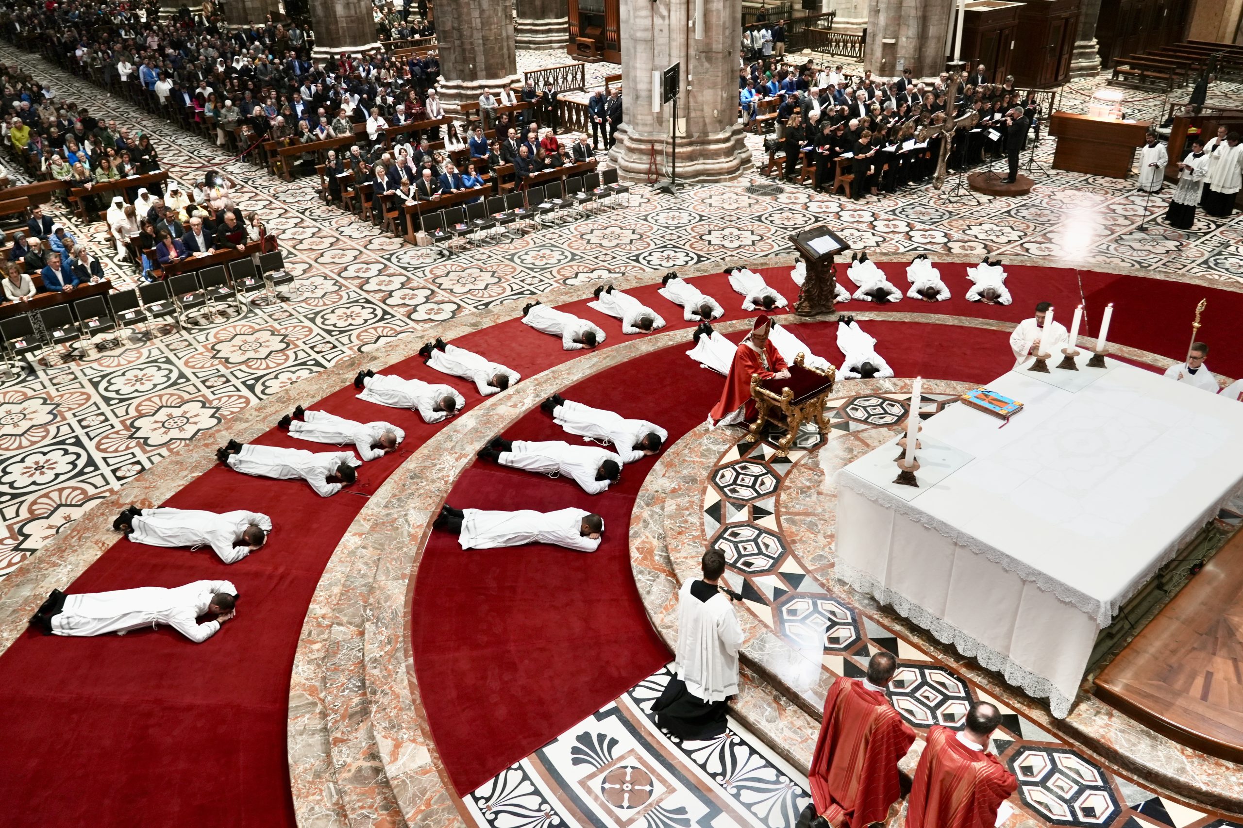 Come gli 11 giovani originari della Diocesi di Milano. con un’età media di 29 anni, cui si aggiungono tre ordinandi rispettivamente del Sud Sudan, del Bangladesh (che hanno compiuto gli studi nel Seminario di Venegono), un 55enne milanese candidato del Vicariato latino di Beirut, con un passato da giornalista, e 6 appartenenti al Pontificio Istituto Missioni Estere. A concelebrare la Messa solenne, 5 vescovi, i membri del Cem, i superiori del Seminario, i sacerdoti delle parrocchie di origine dei candidati, che li hanno accompagnati e accolti nelle loro comunità. Accanto all’Arcivescovo, presso la Cattedra, vi sono il Rettore del Seminario, l’Arciprete del Duomo, il Superiore generale e il Rettore del Pime.