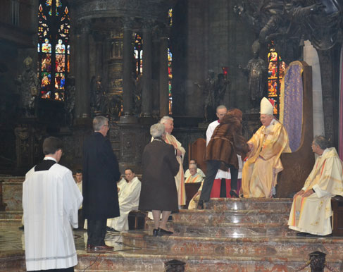 Per l’occasione i responsabili del Movimento Terza Età e dell’Università della Terza Età hanno donato una mitra – copricapo liturgico n.d.r. – al Cardinale Angelo Scola che l’ha indossata per tutta la durata della messa, in segno di gratitudine nei loro confronti e in quelli di tutti gli anziani da loro rappresentati. Gratitudine che il l’Arcivescovo ha manifestato soprattutto per la grande devozione e per la profonda fede che gli anziani del Movimento hanno dimostrato di avere in tutti questi quarant’anni di attività e che il Cardinale si augura che abbiano sempre di più nel futuro.