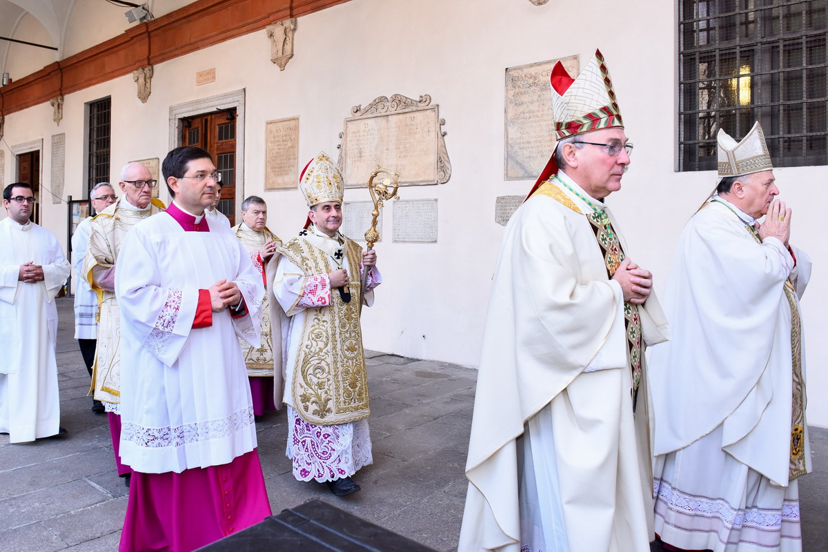 Il riferimento è al Santo che proprio il 7 dicembre del 374, veniva consacrato Vescovo. «Ambrogio si è reso docile al comando del Signore ed è stata immagine viva del buon pastore: ha dato la vita perché la Chiesa fosse unita, segno della vocazione universale a quella vita che rende fratelli. Ha consumato le sue fatiche, le sue sostanze, ha impegnato la sua intelligenza, per liberare la Chiesa dalla dispersione, dalla divisione, dalla rassegnazione, dall’arrendersi alla conflittualità».