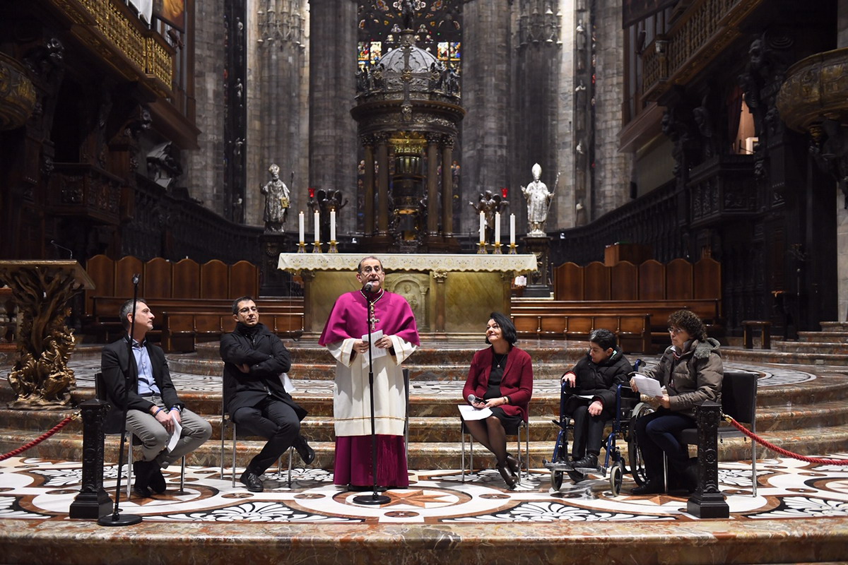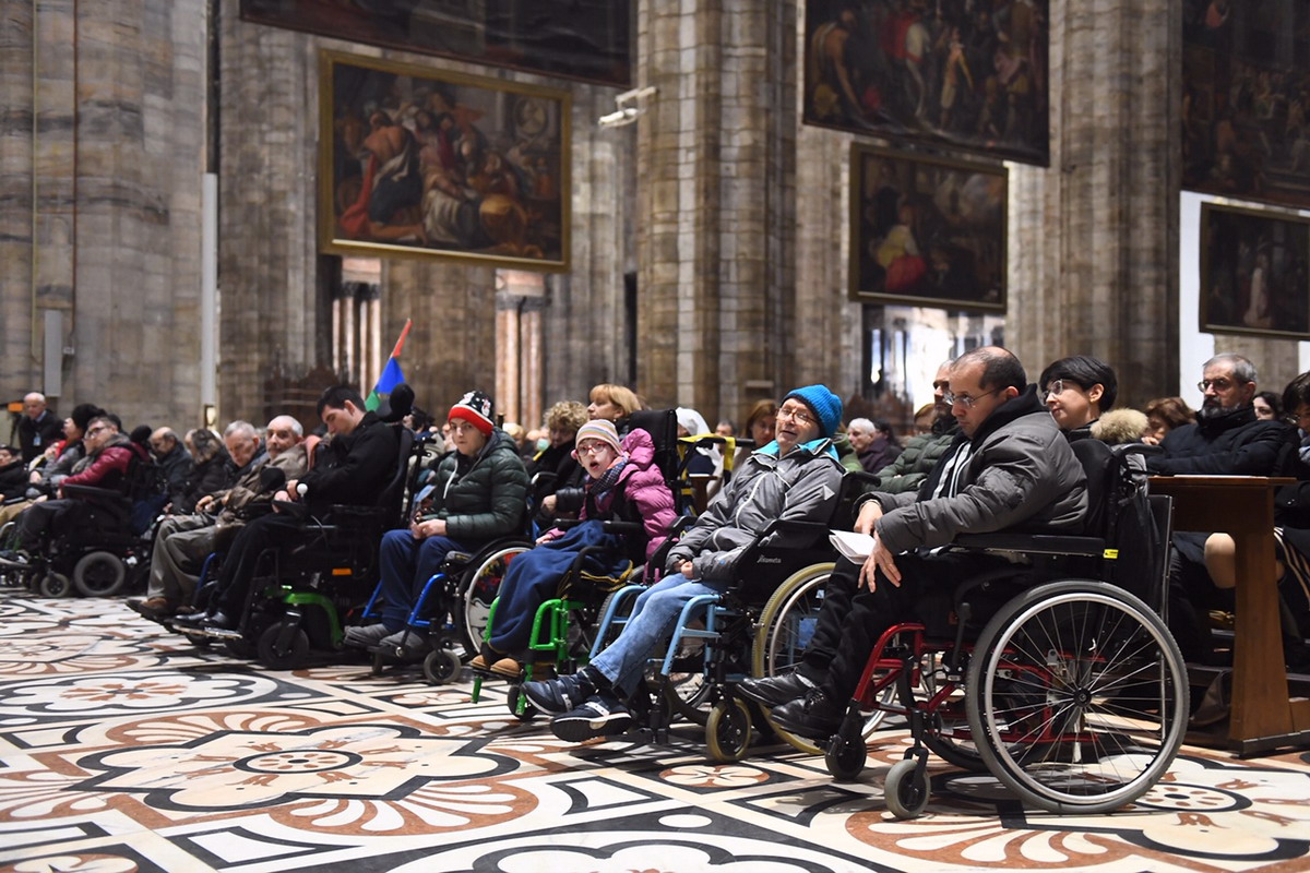 Sembra l’istantanea di quanto va in scena da giorni appena fuori dalle porte della Cattedrale – tra bancarelle e folla, regali di Natale e luci della festa -, ciò che l’Arcivescovo descrive, all’inizio della sua omelia, presiedendo, in Duomo, la Celebrazione per la VI e ultima Domenica dell’Avvento ambrosiano. Tra le navate, trovano posto moltissimi disabili con i loro accompagnatori, i volontari e i familiari. Infatti le tante Associazioni, Onlus, Cooperative, grandi e piccole, attive in questo campo, sono invitate in modo speciale: una trentina quelle presenti, dai non udenti ai ciechi, dalla disabilità motoria a quella cognitiva. Ad esempio, per i non udenti vengono approntati impianti speciali di “spira induttiva” e vi è la traduzione simultanea nella lingua dei Segni.