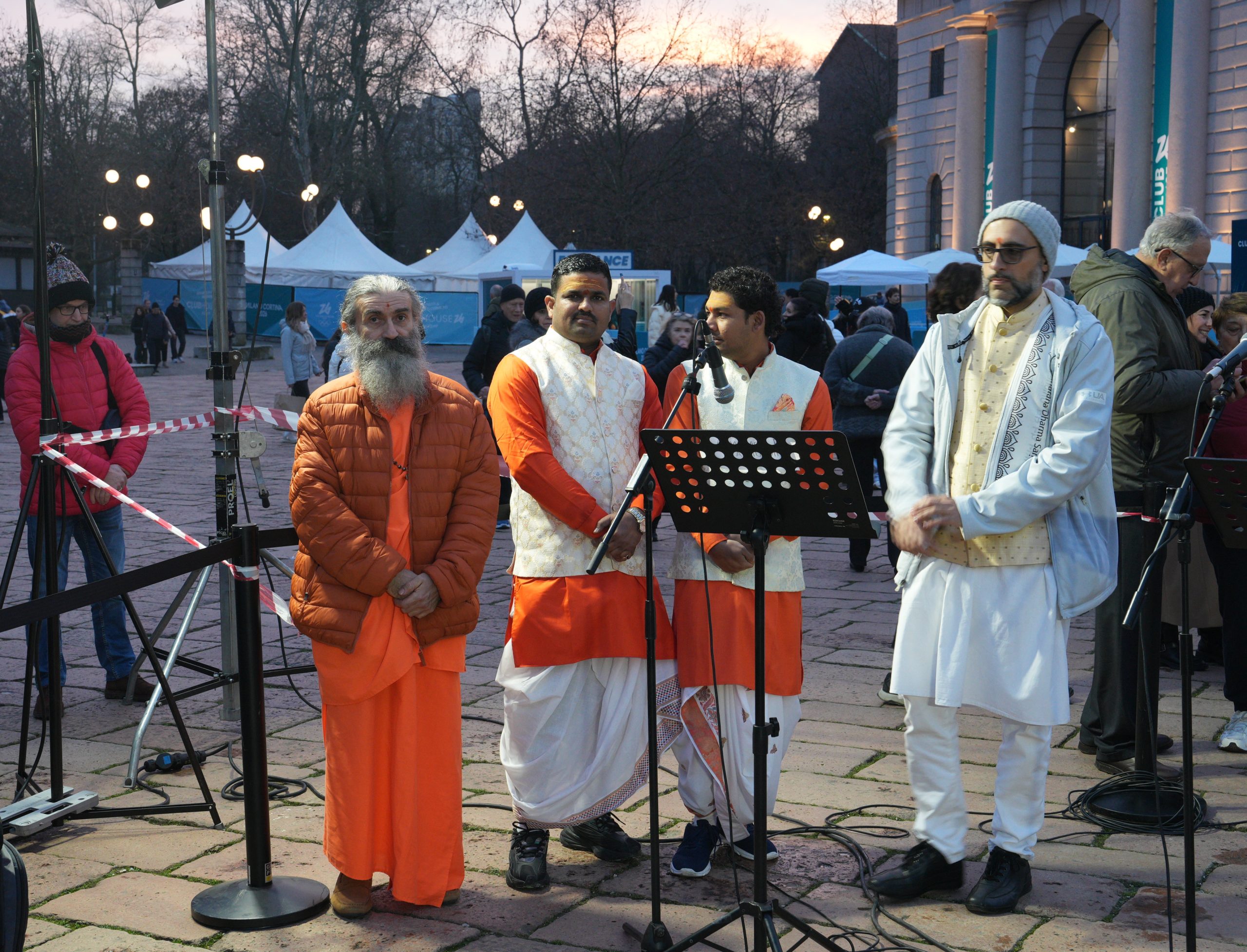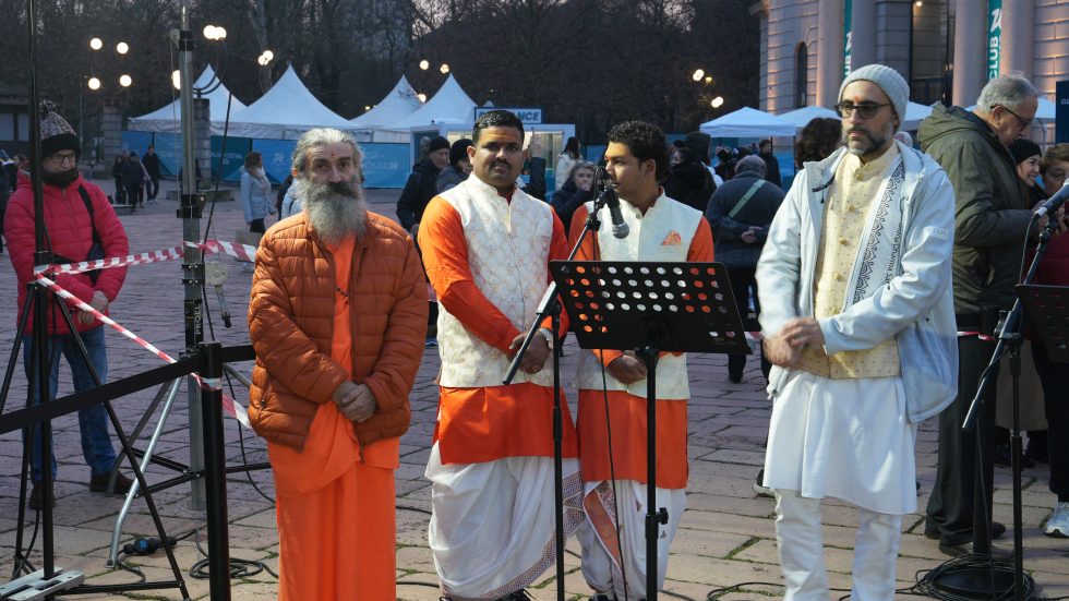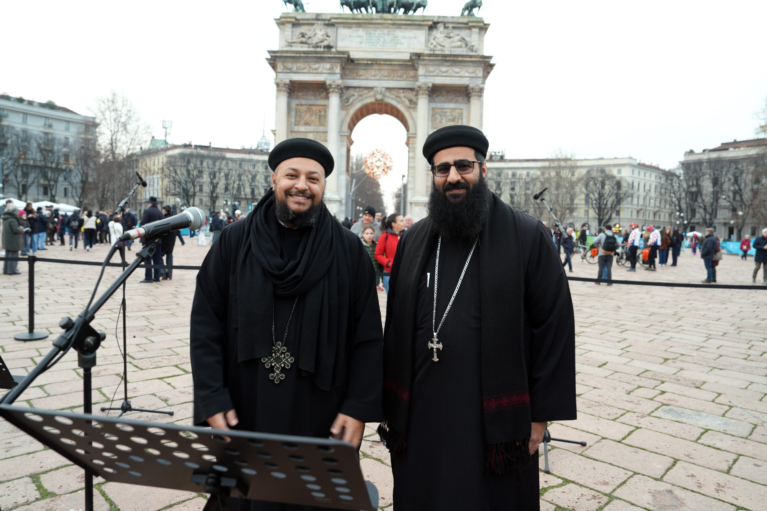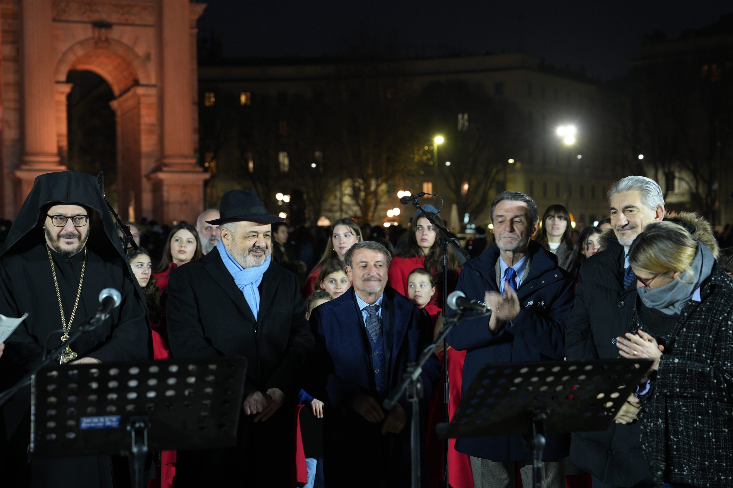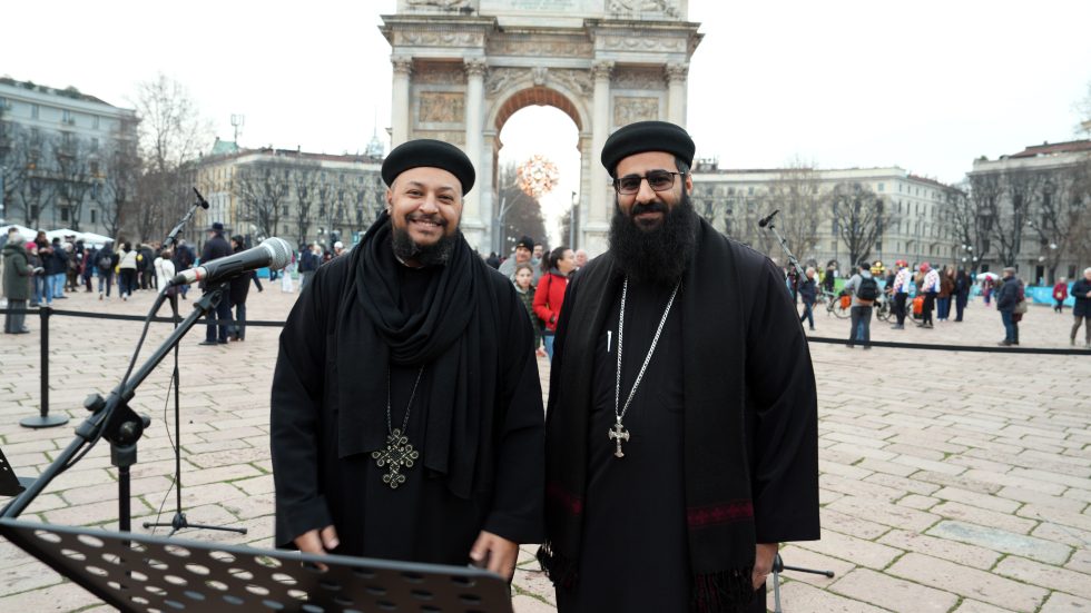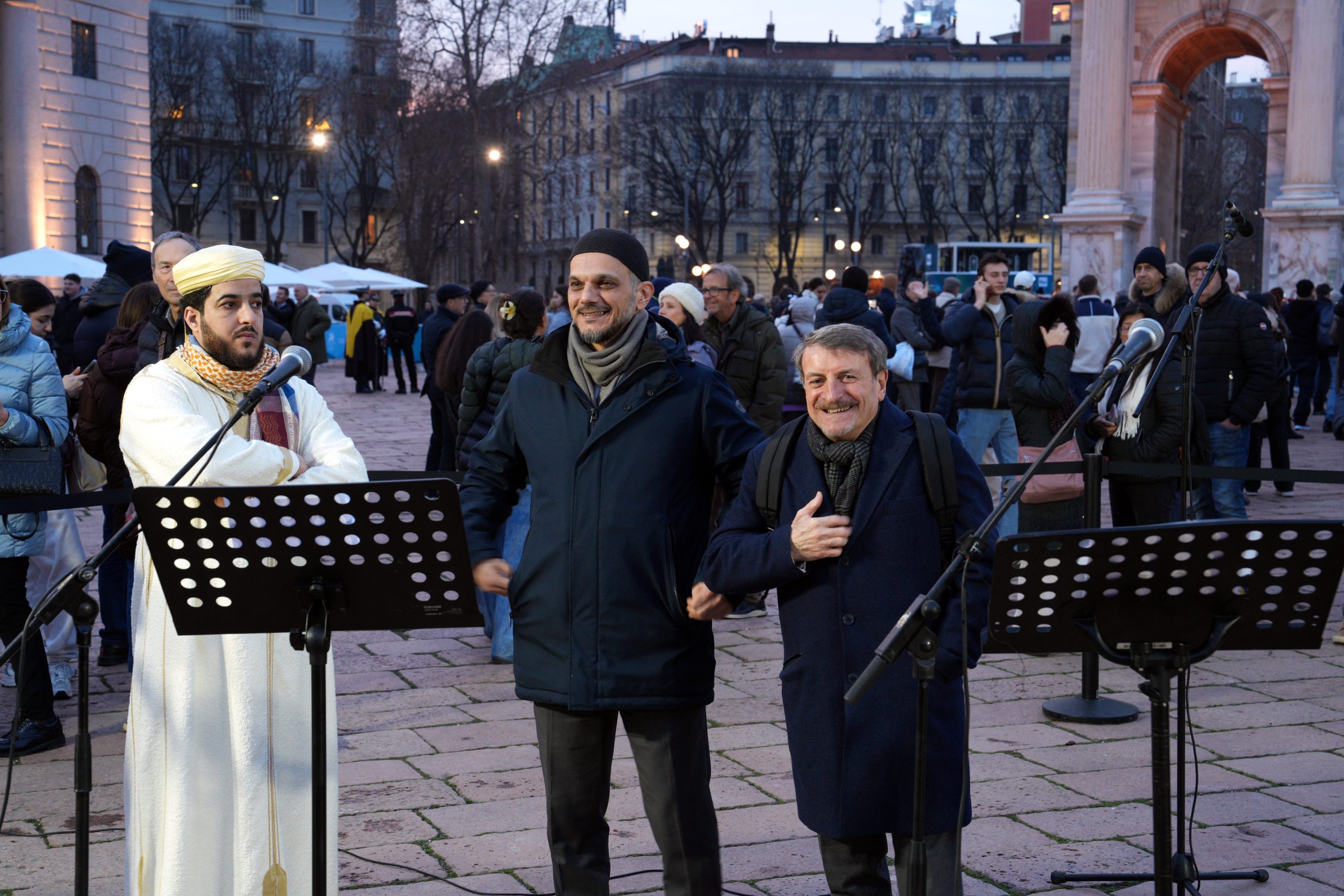 Riuniti a semicerchio tra l’ingresso del Parco Sempione e l’Arco, circondati da tanta gente, si sono così ritrovati i rappresentanti delle fedi aderenti alla Consulta: cinque confessioni cristiane – cattolici, ortodossi, evangelici, protestanti, copti -, la Comunità ebraica, quella musulmana, buddhisti, induisti e sikh. Accanto a loro le autorità, con il presidente di Regione Lombardia Attilio Fontana, il sottosegretario alle Relazioni internazionali ed europee Raffele Cattaneo (delegato per la Consulta), la vicesindaco di Milano Anna Scavuzzo e l’attore Giacomo Poretti, che ha letto, tra l’emozione crescente dei presenti, il Messaggio «di pace, di speranza e responsabilità», rivolto dalla Consulta «a tutte le nazioni, ai partecipanti, agli organizzatori, agli spettatori e a quanti in tutto il mondo guardano a questo evento con entusiasmo e fiducia».