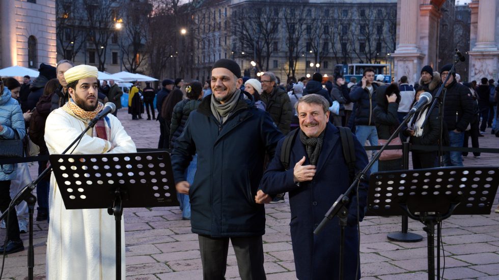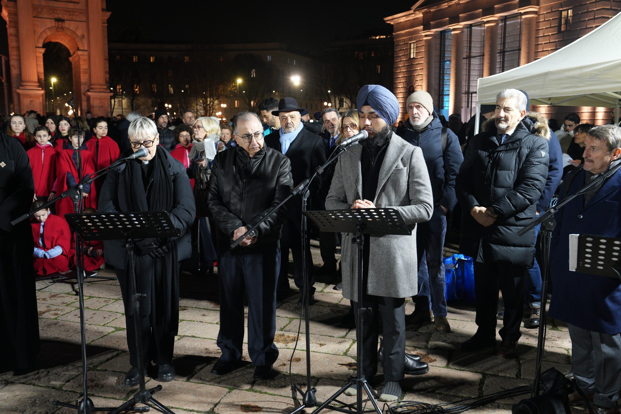 Subito dopo la lettura nel chiaro-scuro della sera, le parole sono divenute un canto intonato da una folta rappresentanza di bimbi e giovani dell’Istituto musicale “Malipiero” di Varese, e una preghiera espressa tra invocazioni, testi sacri, Salmi e melodie tipiche di ciascuna delle singole fedi presenti. Monsignor Luca Bressan, delegato alla Consulta per la Chiesa cattolica (unitamente a don Federico Celini della diocesi di Cremona), ha letto le parole della Messa della pace: «Dio della pace, non ti può comprendere chi semina discordia, non ti può accogliere chi ama la violenza».