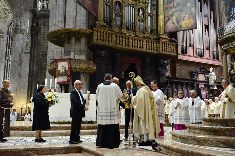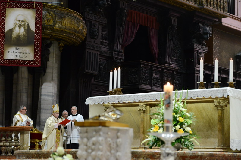 Potrebbe essere questa la cifra sintetica della figura e della tribolata esistenza di padre Arsenio da Trigolo, proclamato beato in Duomo davanti a tanta gente, tra cui la quasi totalità delle suore di Maria Santissima Consolatrice, la Congregazione da lui fondata, e moltissimi studenti ed ex alunni delle loro scuole, provenienti anche dall’estero. Il Rito è stato presieduto dal cardinale Angelo Amato, rappresentante di papa Francesco e prefetto della congregazione delle Cause dei Santi. A concelebrare, l’arcivescovo, monsignor Mario Delpini e altri 15 vescovi, tra cui gli ausiliari di Milano, il vescovo di Cremona – città nella cui provincia si trova Trigolo, paese natio del Beato – Antonio Napolioni e l’emerito, Dante Lafranconi. Non mancano alcuni vescovi Cappuccini, il nunzio in Niger e Burkina Faso, nazione dove è presente la Congregazione, Piergiorgio Bertoldi, il superiore generale dei Cappuccini, padre Mauro Jöhri e il provinciale italiano, padre Sergio Pesenti, il postulatore della Causa, don Carlo Calloni e decine di altri sacerdoti e frati. Nelle prime file ci sono la superiora generale della Congregazione, suor Silvianita Galimberti, alcune Provinciali (ad esempio del Brasile), accanto a diversi sindaci, tra cui il rappresentante per Milano, l’assessore Rabaiotti e il sindaco di Trigolo.