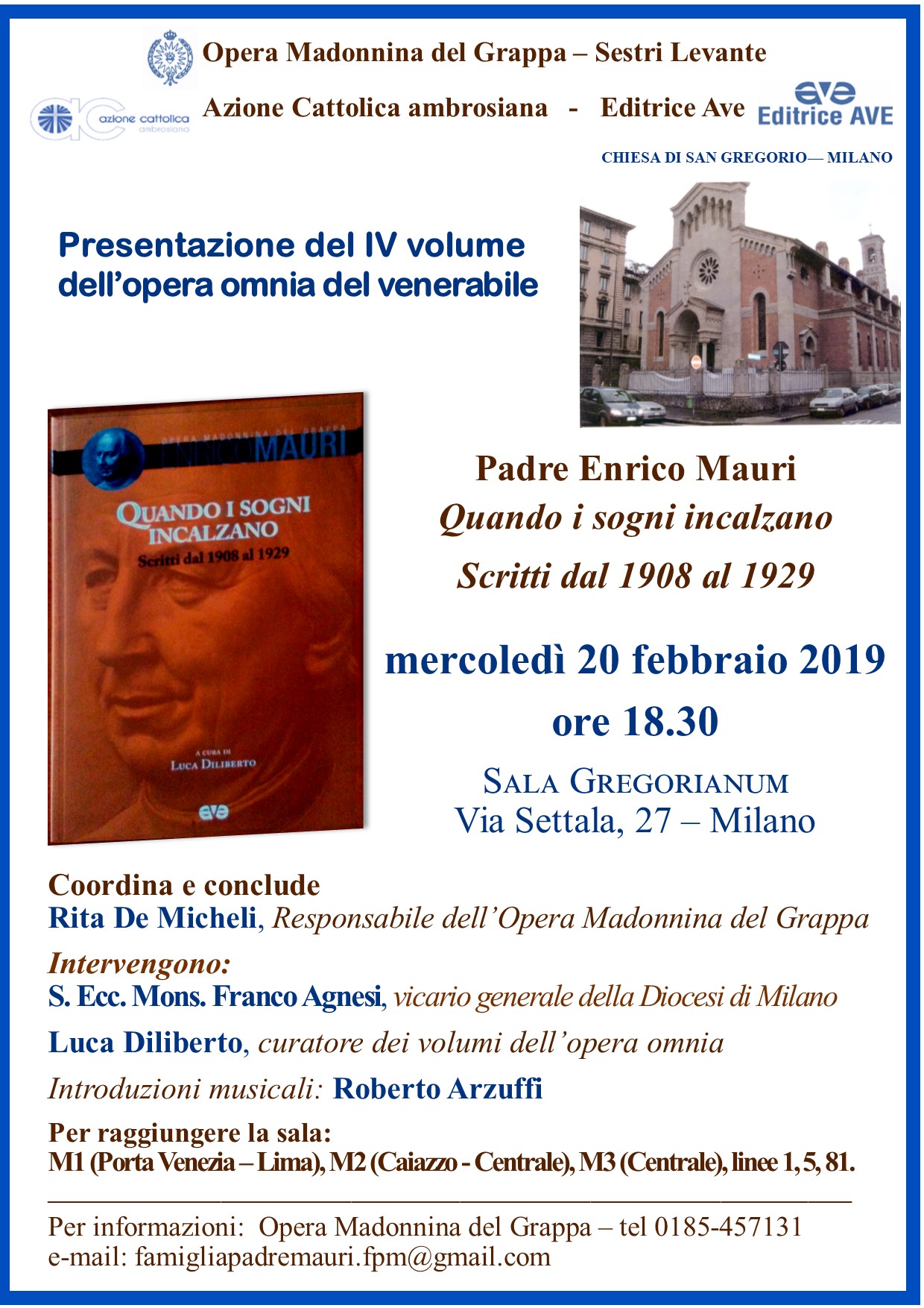 Nello scorso mese di maggio papa Francesco ha autorizzato la Congregazione dei Santi in Vaticano a dichiarare Venerabile padre Enrico Mauri (1883-1967): un primo traguardo per la causa di beatificazione, avviata nella Diocesi di Chiavari tra il 1996 e il 2001. Grazie a questa significativa novità proveniente da Roma, proseguono gli studi su padre Mauri, tanto che è disponibile il quarto volume della sua Opera omnia. Il testo verrà presentato mercoledì 20 febbraio, alle 18.30, presso la Sala Gregorianum, a Milano. Con il curatore dell’importante volume, il professor Luca Diliberto, converserà il Vicario generale della diocesi di Milano, monsignor Franco Agnesi, in un dialogo coordinato da Rita De Micheli, responsabile dell’Opera Madonnina del Grappa. La serata sarà accompagnata da intervalli musicali di Roberto Arzuffi.