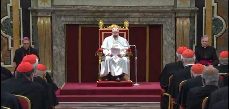 «In questi giorni abbiamo avvertito quasi sensibilmente l’affetto e la solidarietà della Chiesa universale, come anche l’attenzione di tante persone che, pur non condividendo la nostra fede, guardano con rispetto e ammirazione alla Chiesa e alla Santa Sede». Con queste parole Papa Francesco si è rivolto oggi a tutti i cardinali (elettori e non elettori) nell’incontro tenuto nella Sala Clementina del Palazzo apostolico.