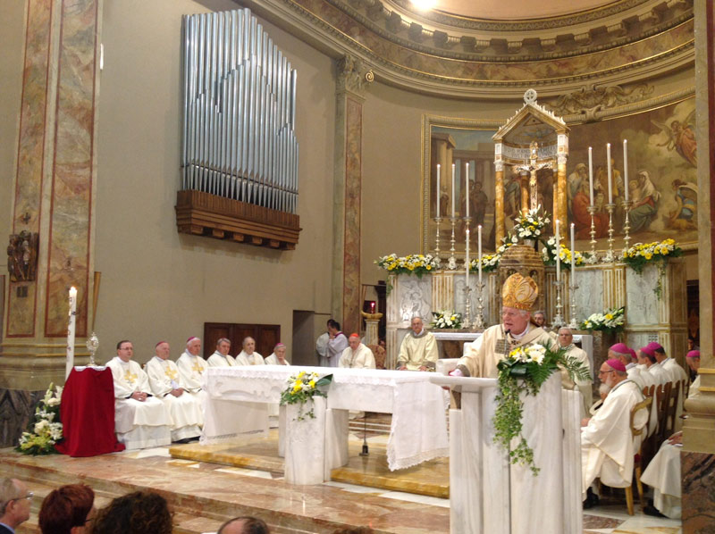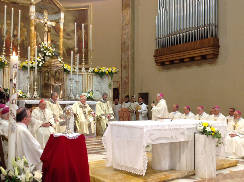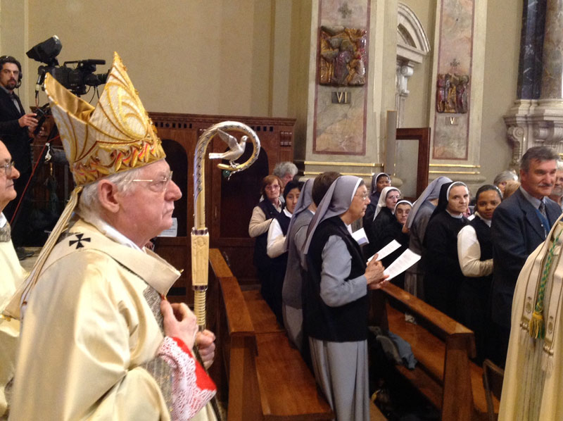 San Giovanni XXIII come «un punto di arrivo di una plurisecolare tradizione pastorale e solidissimo punto di partenza per una rinnovata proposta della storia della salvezza a ogni uomo». Lo dice il cardinale Scola che, come metropolita della Regione ecclesiastica Lombarda, nella chiesa parrocchiale San Giovanni Battista a Sotto il Monte, presiede l’Eucaristia di ringraziamento per la canonizzazione e in memoria di papa Roncalli nel 51° anniversario della morte. Nel paese natale – «culla di Angelino, come lo chiamavano ancora da adulto» – sono in tantissimi: accanto al Cardinale, il cardinale Dionigi Tettamanzi, monsignor Beschi , vescovo di Bergamo, i Vescovi lombardi, alcuni ausiliari ambrosiani, Vescovi e sacerdoti nativi o legati alla Diocesi orobica, anche gli otto preti novelli bergamaschi ordinati la settimana scorsa.