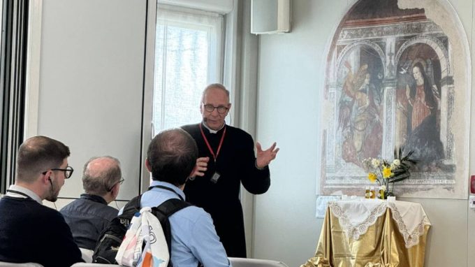 Questa immagine ci si para davanti subito nella mattinata a Norcia, accolti da monsignor Renato Boccardo, Arcivescovo di Spoleto-Norcia, che ci ha condotti all’interno della Basilica del Santo gravemente corrotta dal terremoto del 2016, oggi trasformata in un enorme cantiere (così come l’adiacente chiesa cattedrale). Salva solo la facciata, il resto della basilica è sotto restauro, compresa la cripta scavata sotto la casa natale di Benedetto e Scolastica. Poiché tutte le chiese di Norcia sono inagibili, l’intera comunità cristiana si ritrova presso il Centro della Comunità Madonna delle Grazie, edificato da Caritas Italiana poco distante dal centro storico, dove ci siamo radunati per l’incontro con il Vescovo e la celebrazione eucaristica da lui presieduta.