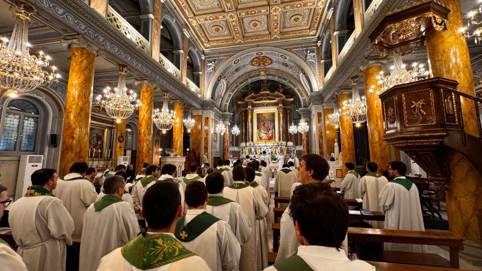 Mentre qualche fiocco di neve cade dolcemente, il quarto giorno del pellegrinaggio si apre con la Messa nella chiesa francescana di Santa Maria Draperis.