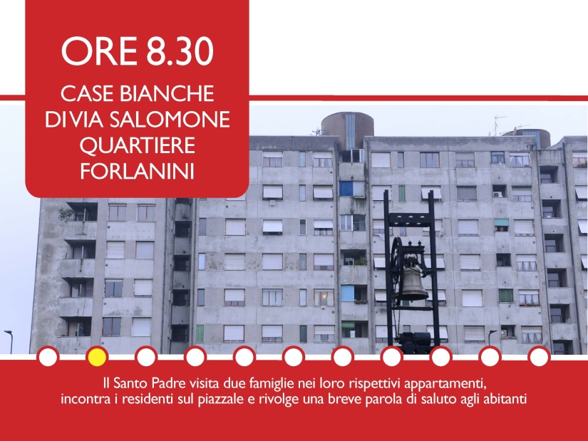 La prima tappa, alle 8.30, alle Case Bianche di via Salomone-via Zama, nella parrocchia di San Galdino: papa Francesco visiterà due famiglie. Alle 9, sul piazzale, rivolgerà un breve saluto e incontrerà i rappresentanti delle famiglie residenti e di famiglie Rom, islamiche, immigrate.