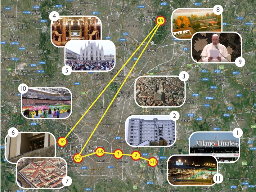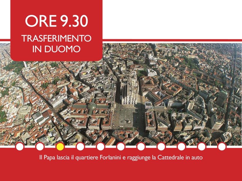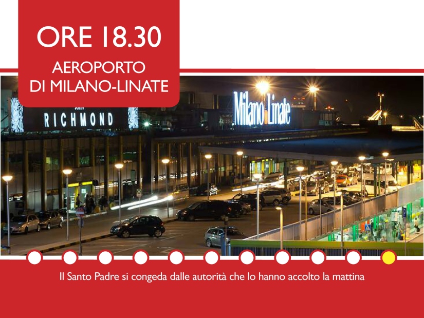 Il Santo Padre partirà alle 7.10 dall’aeroporto di Ciampino. Alle 8 è previsto l’arrivo all’Aeroporto di Milano-Linate, dove il Papa sarà accolto dall’Arcivescovo e dalle istituzioni.