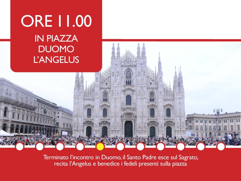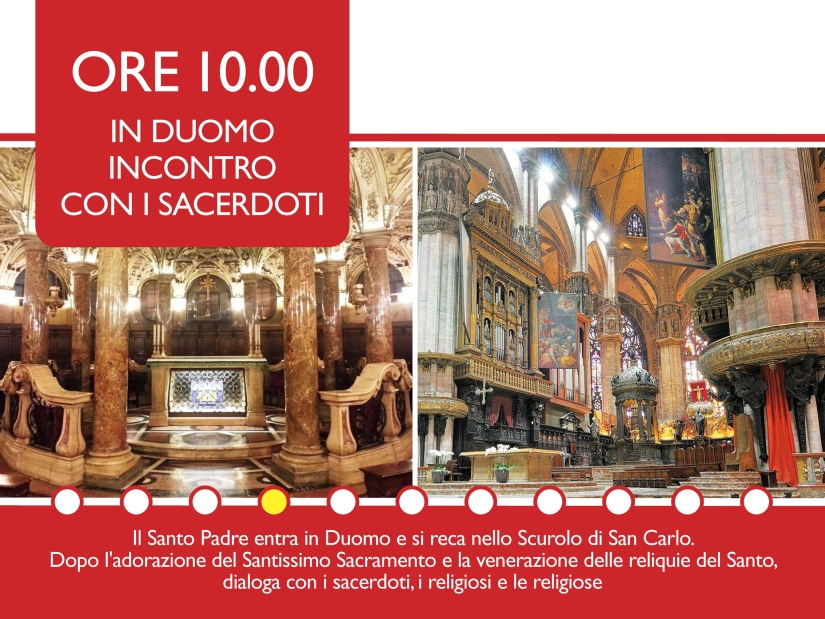 Poi lo spostamento in auto verso il Duomo, con arrivo previsto alle 10. All’ingresso il Santo Padre sarà accolto dai Vescovi ausiliari, dall’Arciprete e dal Capitolo metropolitano. In Cattedrale si recherà nello scurolo di San Carlo per l’adorazione del Santissimo Sacramento e la venerazione delle reliquie di San Carlo; incontrerà i sacerdoti e i consacrati; riceverà il saluto del cardinale Scola; risponderà ad alcune domande dei sacerdoti. Alle 11 saluterà i fedeli radunati in Piazza Duomo, reciterà l’Angelus e benedirà i fedeli sulla piazza.