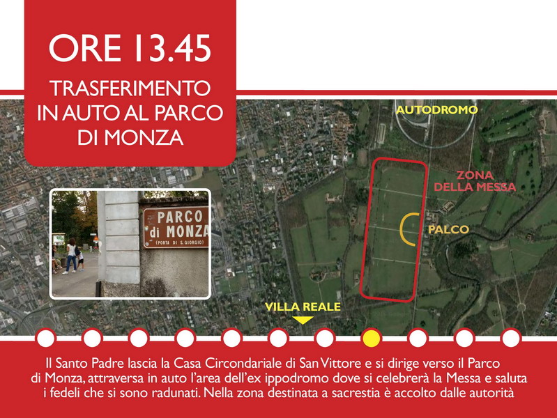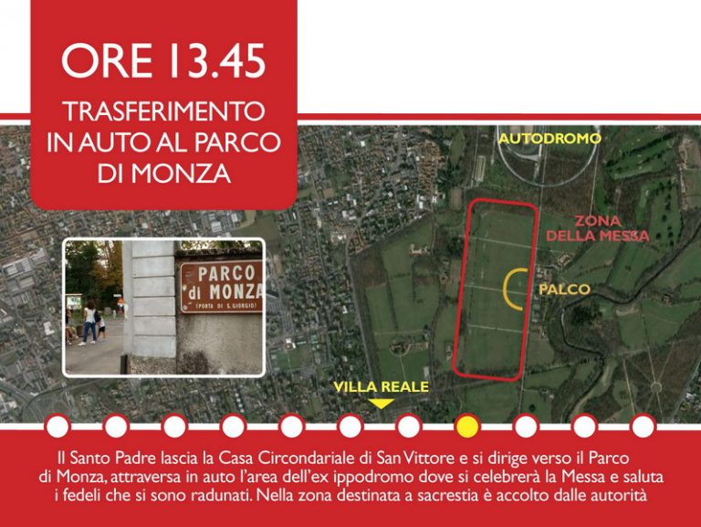 Alle 13.45 il Santo Padre lascerà San Vittore e si trasferirà in auto al Parco di Monza, dove, nell’area dell’ex ippodromo, attraverserà i vari reparti in cui è suddivisa l’area, salutando i fedeli. Nella zona della sacrestia sarà accolto dalle Autorità locali e avrà un breve incontro con i Vescovi concelebranti e gli organizzatori della visita. Alle 15 avrà inizio la solenne concelebrazione eucaristica, al termine della quale il cardinale Scola porgerà il suo ringraziamento.