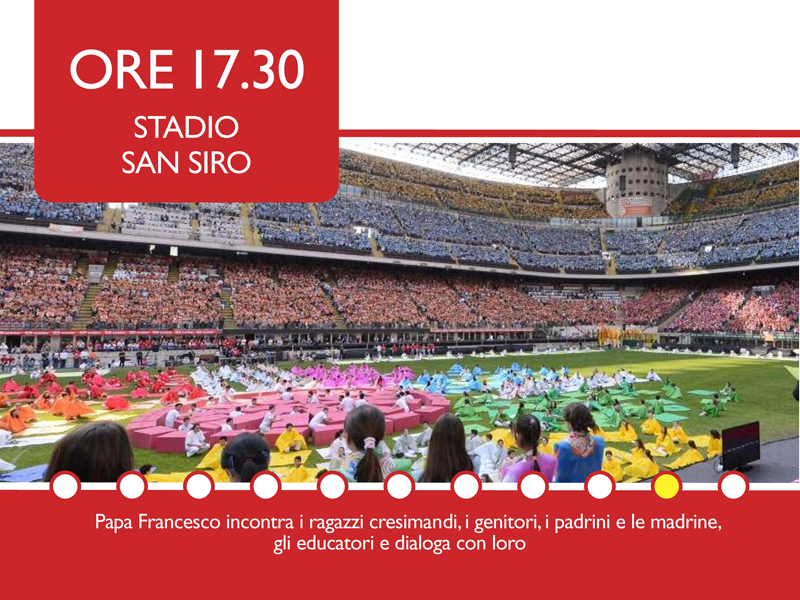 Alle 16.30 il trasferimento per l’ultima tappa allo Stadio Meazza a San Siro dove, alle 17.30, incontrerà i ragazzi cresimandi, i genitori, i padrini e le madrine, rispondendo ad alcune domande di un cresimando, di un genitore e di un catechista.
