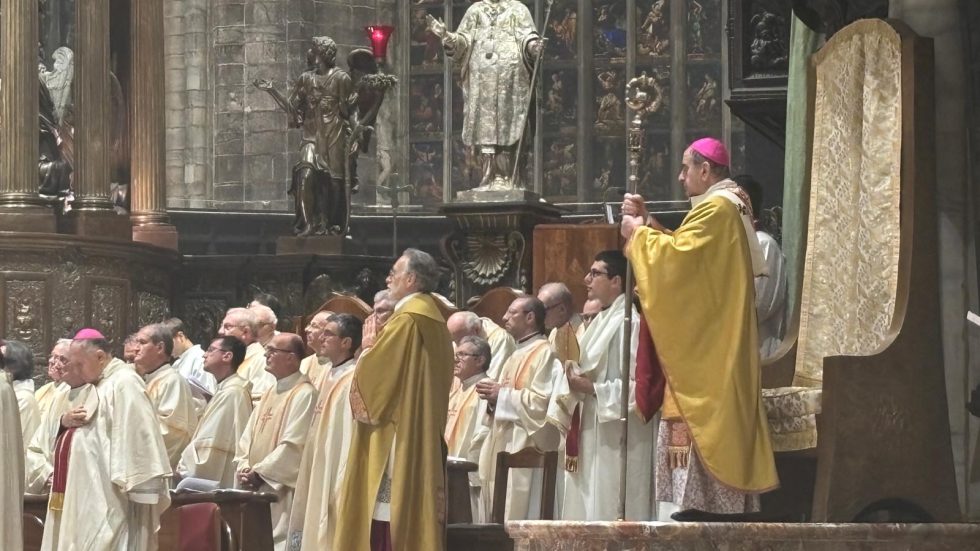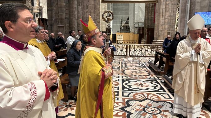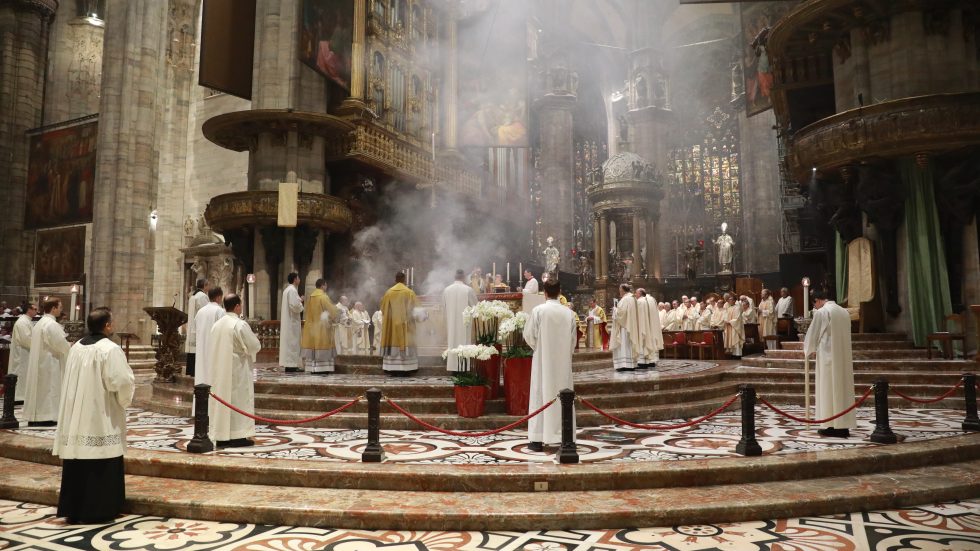 Servire senza cercare «gli applausi e il successo» come fece san Carlo «infaticabile» nella sua predicazione e nel non abbandonare mai il suo popolo anche nei momenti più difficili come durante la peste del 1576, tanto che l’epidemia venne definita «la peste di san Carlo». Tanto, dopo quasi mezzo millennio, è ancora venerato e ricordato come il vero riformatore della Chiesa ambrosiana. San Carlo – e basta il nome di battesimo – alle cui spoglie, conservate nello Scurolo sottostante l’altare maggiore della Cattedrale, l’Arcivescovo prima che inizi la Messa rende omaggio, incensando l’urna e cantando la Sallenda, unitamente ai 9 vescovi, tra ausiliari e nativi della Diocesi, tra cui il delegato della Santa Sede alle Nazioni Unite, monsignor Gabriele Caccia. Concelebranti come anche i membri del Cem e i Canonici del Capitolo della Cattedrale e i Decani, che per l’intera giornata si erano riuniti per la loro assemblea. Molti i segni che parlano visivamente del Santo con la presenza, particolarmente significativa, di coloro che rappresentano le Istituzioni fondate o rifondate dal Borromeo: il rettore del Seminario, don Enrico Castagna, accompagnato dai diaconi e dai seminaristi, il prevosto degli Oblati di San Carlo, padre Giulio Binaghi, il moderator Curiae, monsignor Carlo Azzimonti e l’arciprete del Duomo, monsignor Gianantonio Borgonovo. Non mancano gli appartenenti a Confraternite e Ordini cavallereschi legati alla memoria del primo Borromeo, i seminaristi di Lugano, il Coro degli Alpini della Grigna, i fedeli di Frassineto Po, in provincia di Alessandria – che ancora oggi in alcune occasioni celebrano la liturgia in rito ambrosiano, essendo appartenuti fino all’inizio dell’Ottocento alla Diocesi di Milano -, a cui monsignor Delpini, a conclusione, dona una copia del nuovo Messale.