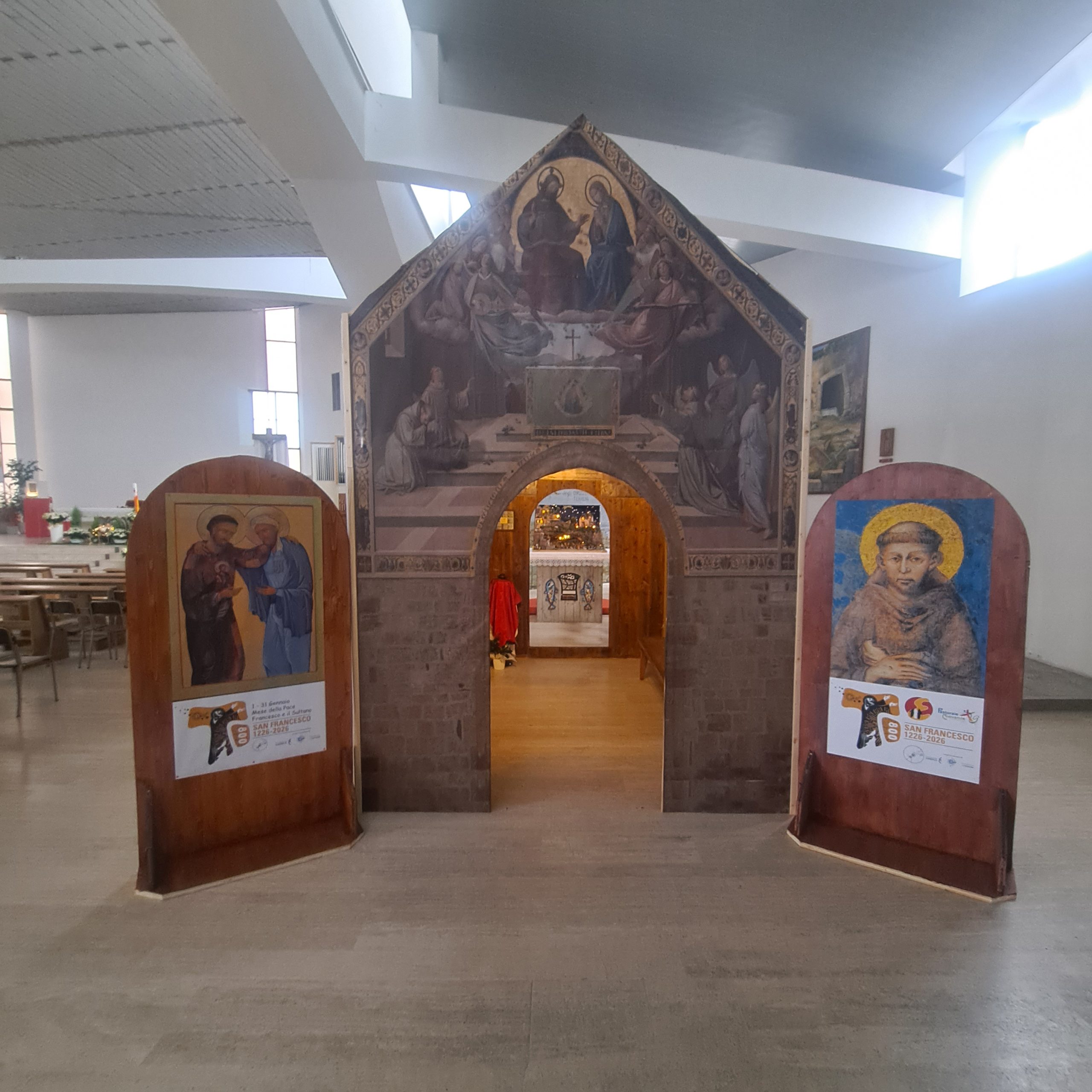 All’interno della piccola chiesetta. sul lato destro. trovano spazio le stampe che riproducono i 28 affreschi di Giotto che raccontano la vita di San Francesco. Nella parete di sinistra ogni mese ci sarà una piccola mostra permanente con questi temi: Gennaio (Francesco e il Sultano) – Febbraio (i luoghi Francescani) – Marzo (Francesco e la Croce) – Aprile (Francesco e gli Angeli) – Maggio (Francesco e Mara) – Giugno (il Cantico delle Creature) – Luglio (Francesco – il Papa e il Perdono di Assisi) – Agosto (Francescoe Chiara) – Settembre (Francesco – Padre Pio e le stimmate) – Ottobre (Francesco e l’Italia) – Novembre (Francesco e i Santi Francescani) – Dicembre (Francesco e la Natività).