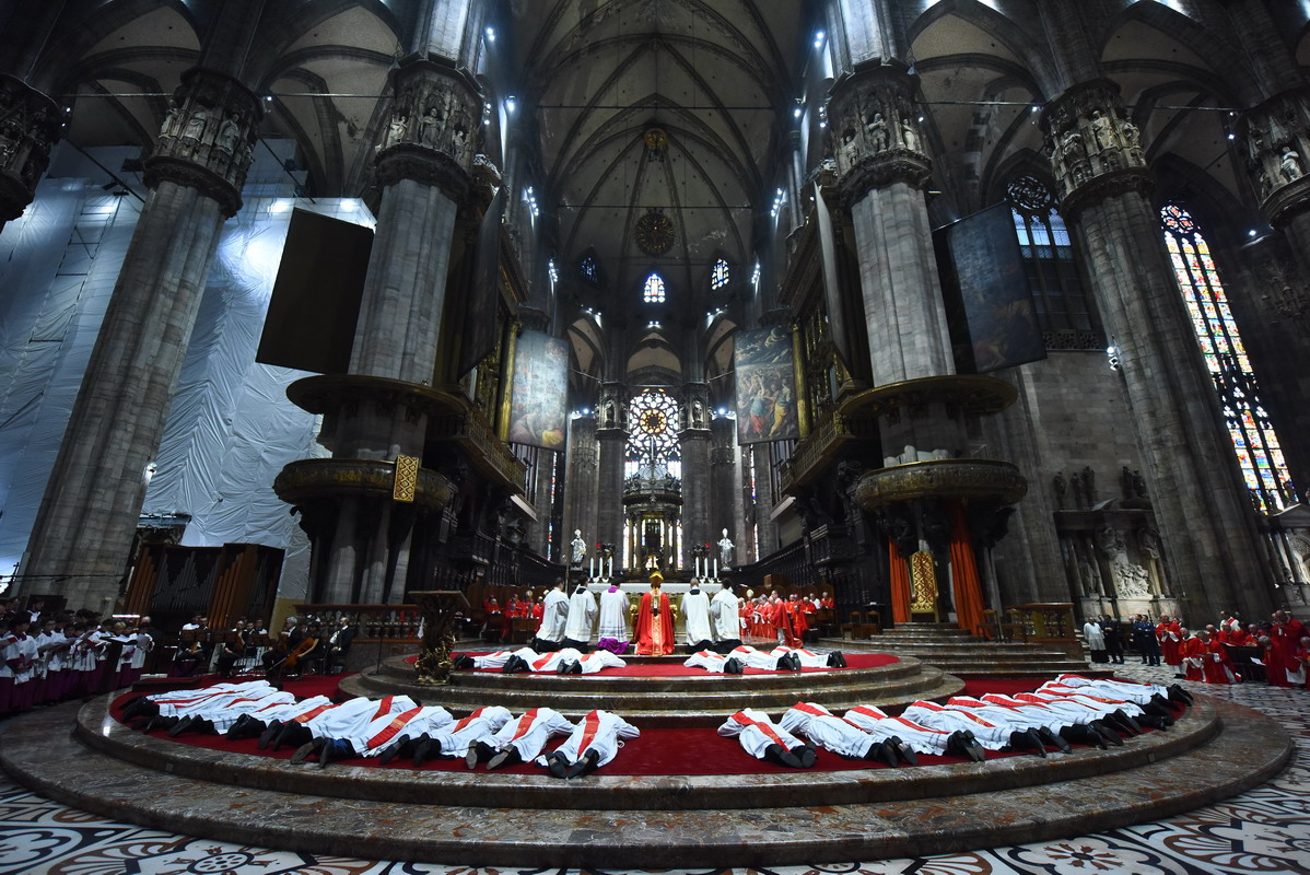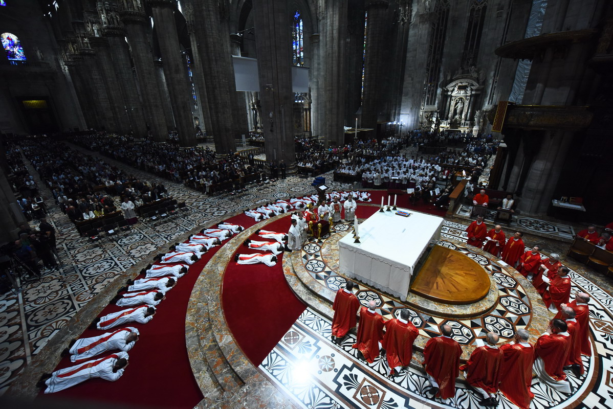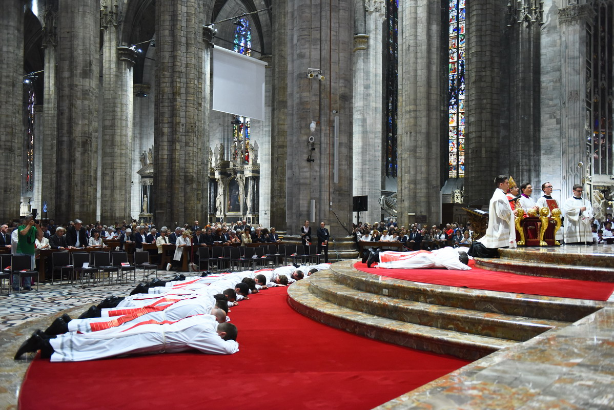 L’Arcivescovo che ordina 29 nuovi sacerdoti, in un Duomo gremito di migliaia di persone mentre all’esterno tanti ancora attendono di poter entrare, dice con chiarezza cosa significhi donare l’intera vita al Signore facendo il prete. Anche se si proviene da vicende esistenziali differenti, da esperienze che parlano spesso di una vita precedente già impegnata nell’ambito lavorativo, di età e situazioni diverse. 23 i presbiteri ambrosiani 2018, 5 i candidati del Pontificio Istituto delle Missioni Estere (4 originari dell’India e 1 del Cameroun), 1 per la Congregazione Benedettina Olivetana dell’Abbazia di Seregno. Tra i 23, espressione della Diocesi, il più “anziano” ha 46 anni, i più giovani la metà: ci sono 3 ingeneri, 2 architetti, diplomati, ex legali ed ex bancari. Insomma, un universo variegato, ma tutti insieme, con emozione, sono davanti a monsignor Delpini, che per la prima volta presiede il Rito delle Ordinazioni presbiterali, concelebrato da 11 Vescovi – il cardinale Angelo Scola e il patriarca copto del Cairo, Sidrak Ibrahim Isaac, assistono –, da 50 tra Vicari episcopali, Canonici del Duomo, Superiori ed Educatori del Seminario con il rettore, monsignor Michele Di Tolve e da oltre 300 sacerdoti. Tra i concelebranti anche l’abate dell’Abbazia di Seregno, Monsignor Michelangelo Tiribilli e il Superiore generale del Pime, padre Ferruccio Brambillasca.