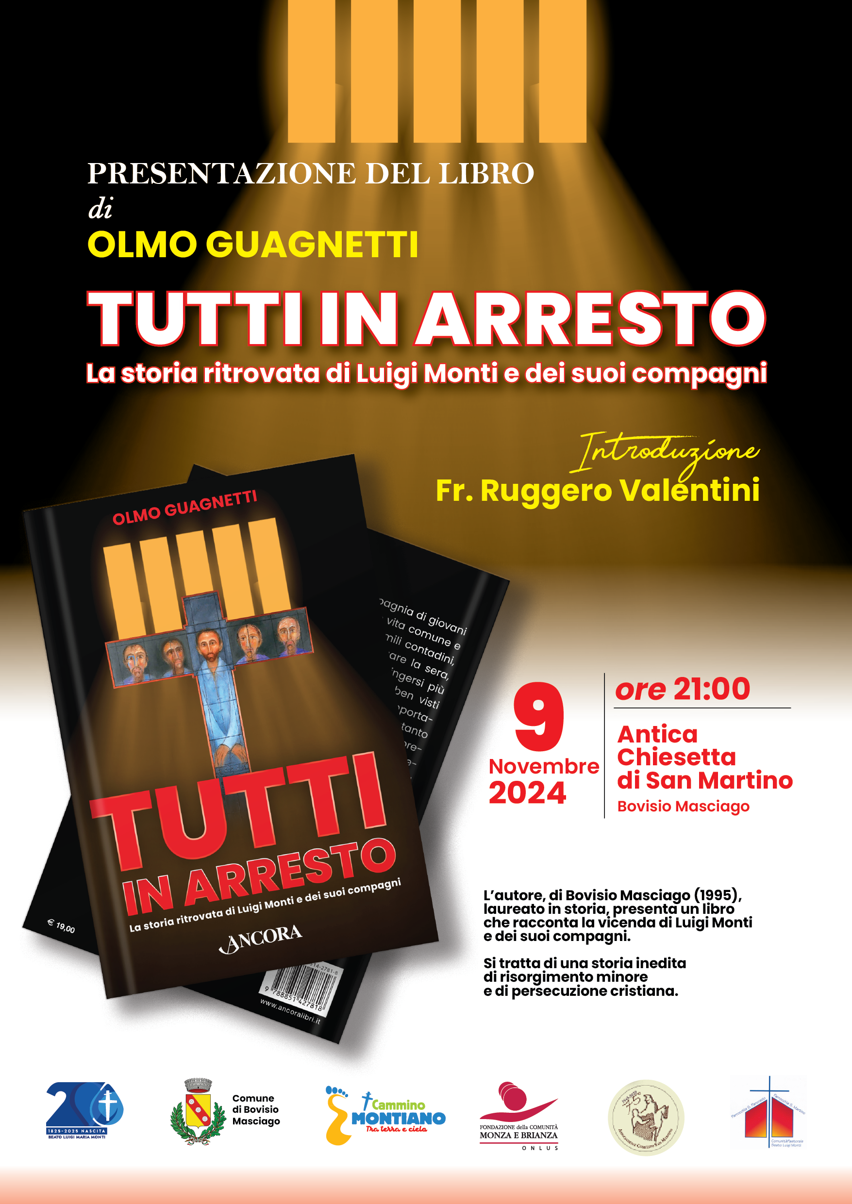 È una storia di protagonismo giovanile e di persecuzione cristiana, quella raccontata in Tutti in arresto, la storia ritrovata di Luigi Monti e dei suoi compagni, pubblicata da Àncora (260 pagine, 19 euro) che verrà presentato sabato 9 novembre alle 21 presso l’Antica chiesetta di San Martino a Bovisio Masciago. Scritto dal giovane storico Olmo Guagnetti – residente a Bovisio, città di nascita del Beato -, narra fatti di metà Ottocento che coinvolsero il giovane Luigi Monti e una quarantina di compagni.