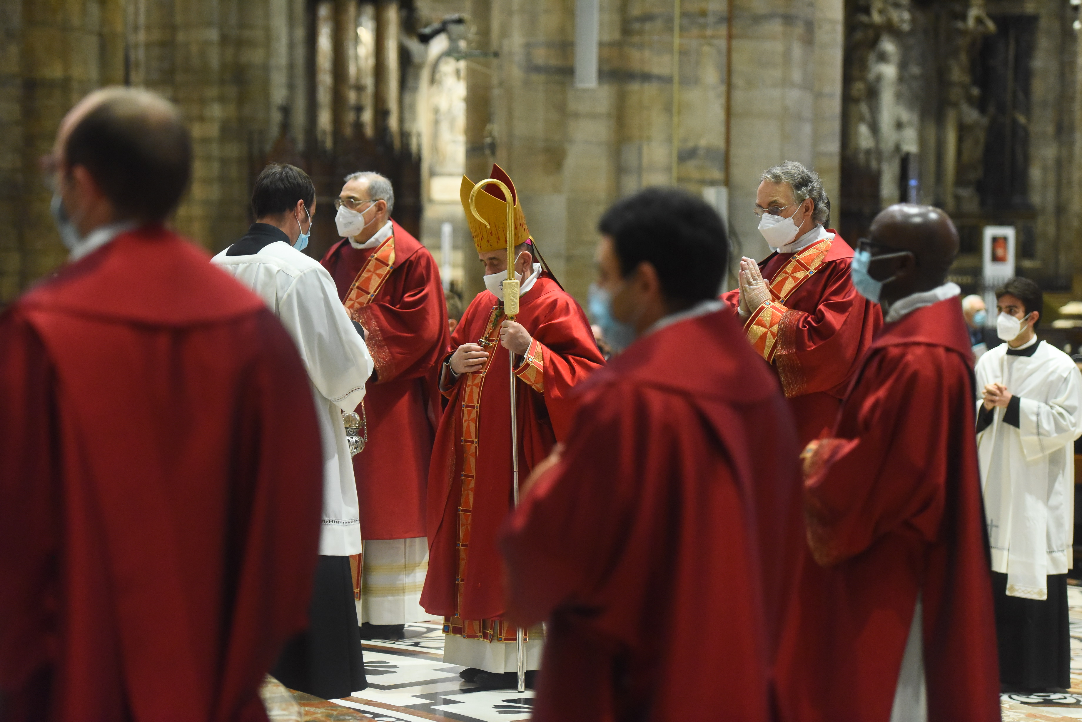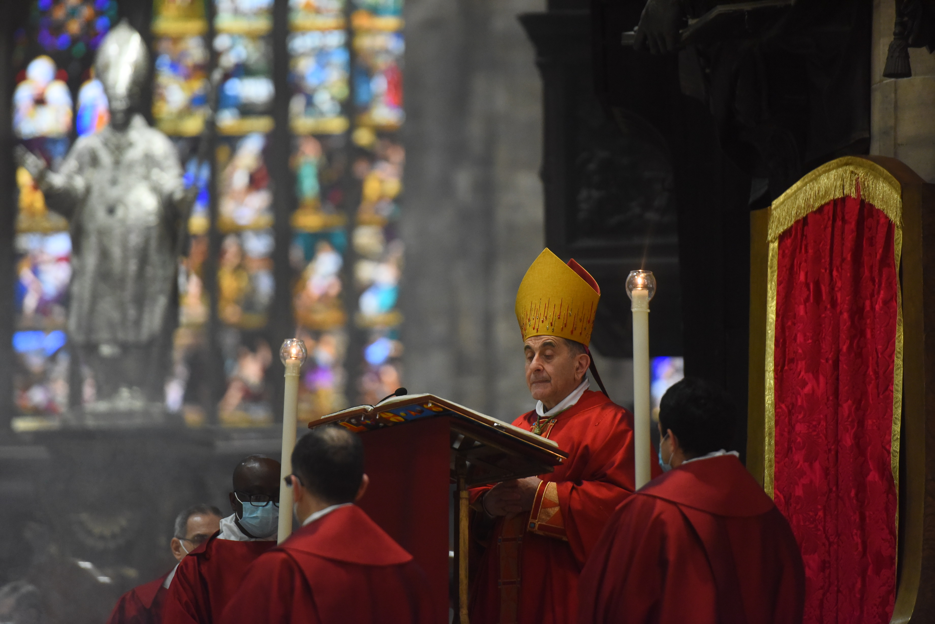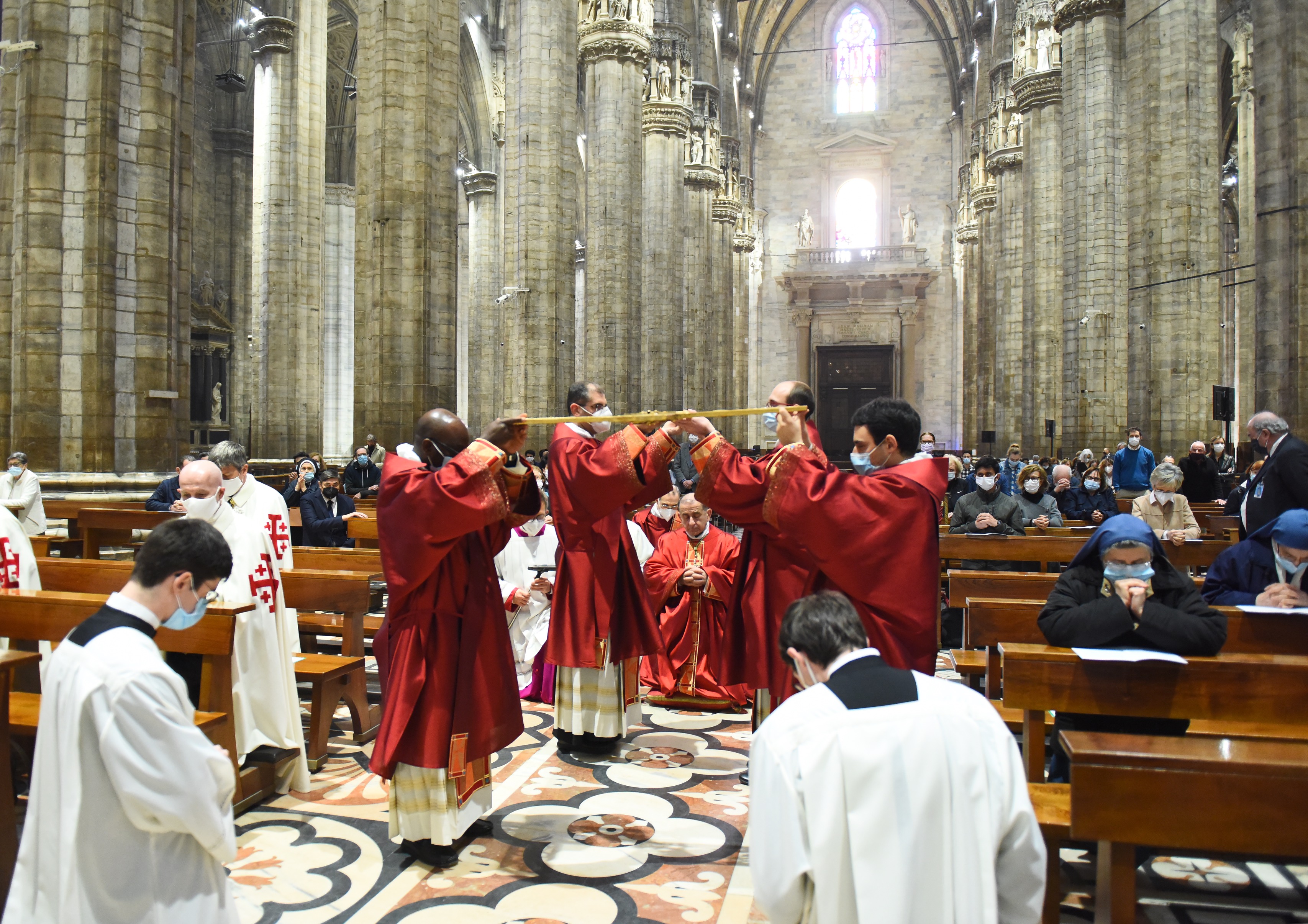 In un momento decisivo dell’intero Anno liturgico e della vita dei cristiani, la Celebrazione della Passione e della Deposizione del Signore – definita anche “Pasqua di Crocefissione” nell’antico Rito ambrosiano – dice così l’Arcivescovo che la presiede in Duomo. In altare maggiore, siedono i vescovi – monsignor Agnesi, Mascheroni, Merisi, Martinelli, e i Canonici del Capitolo metropolitano.